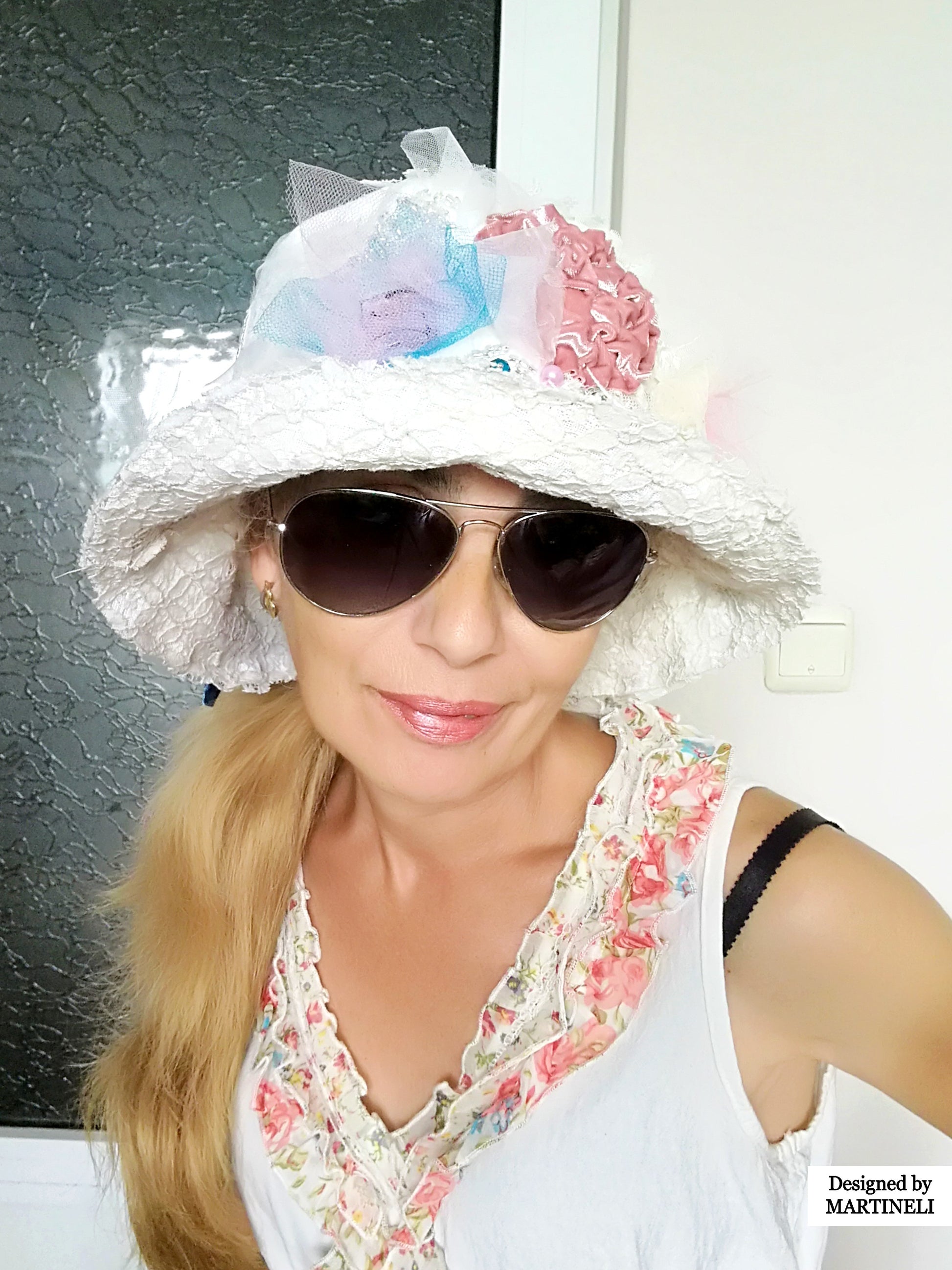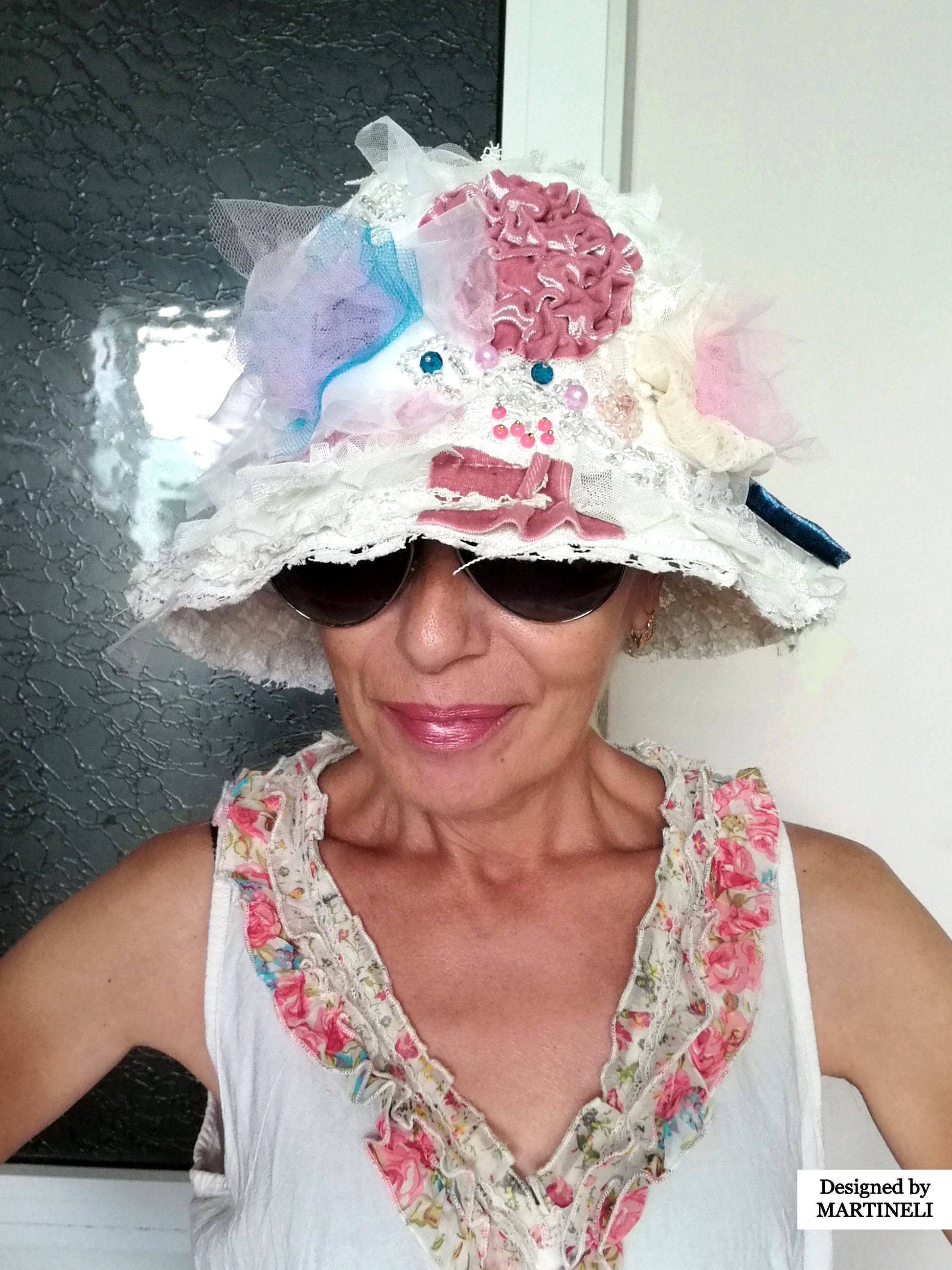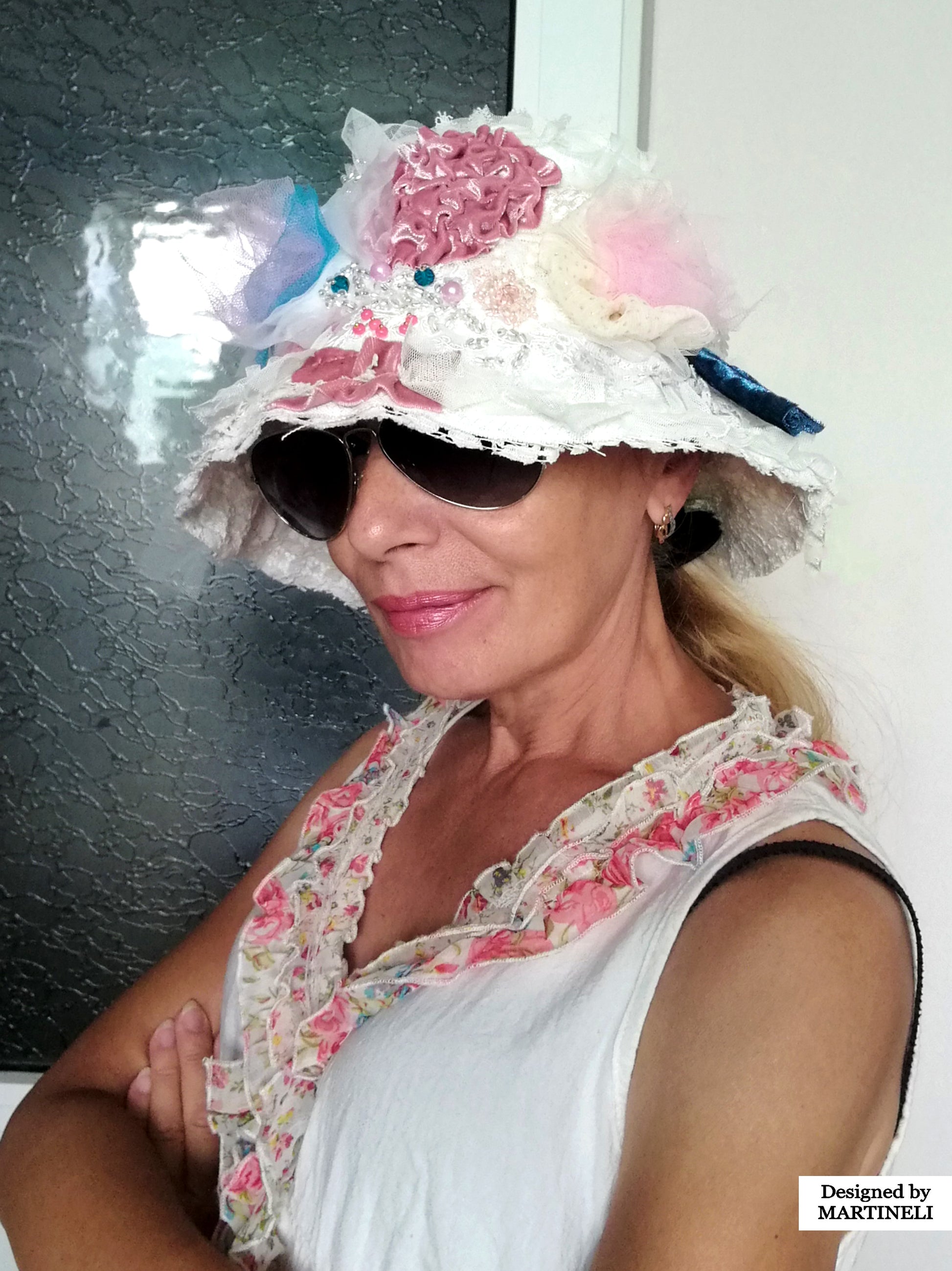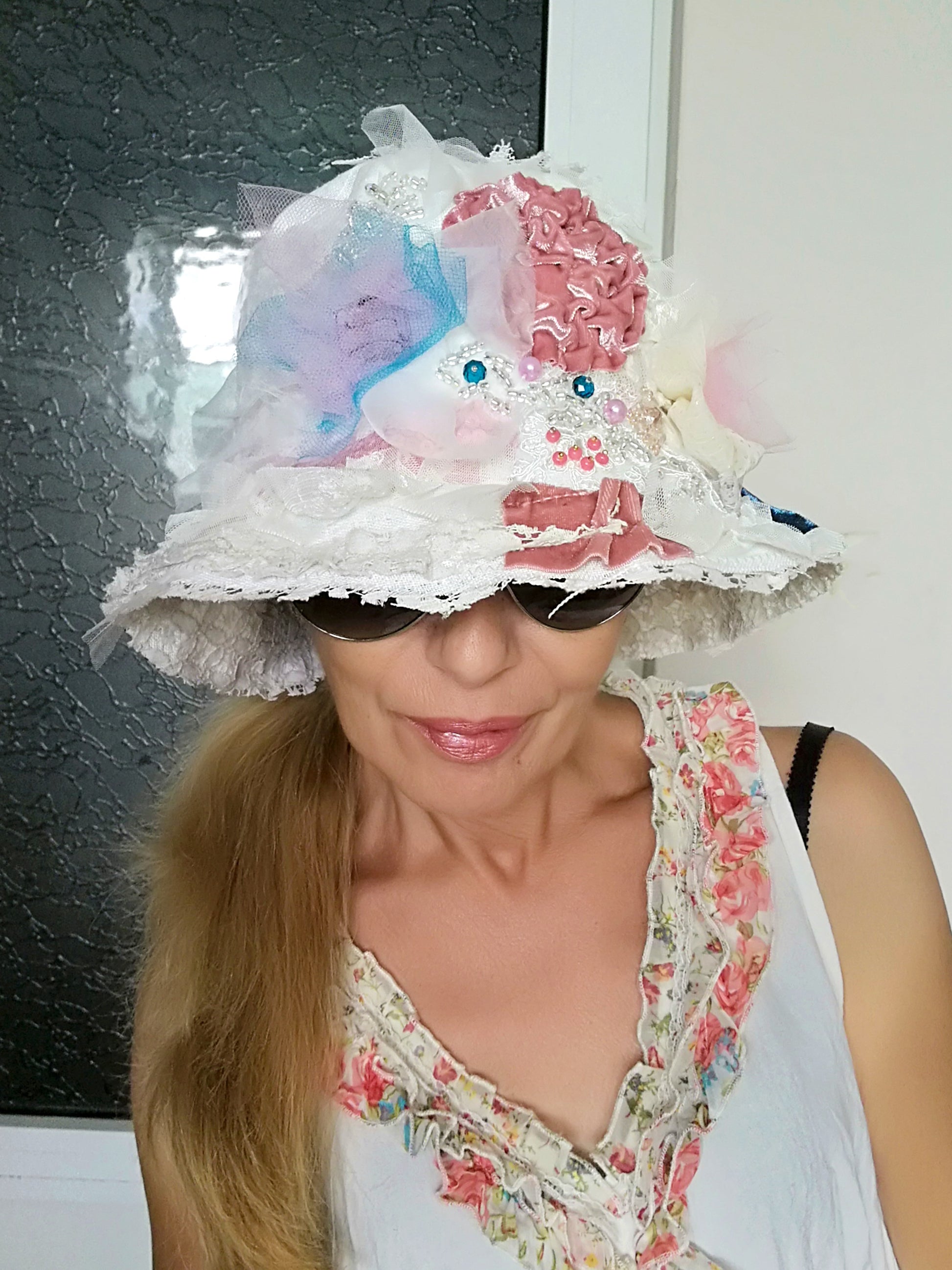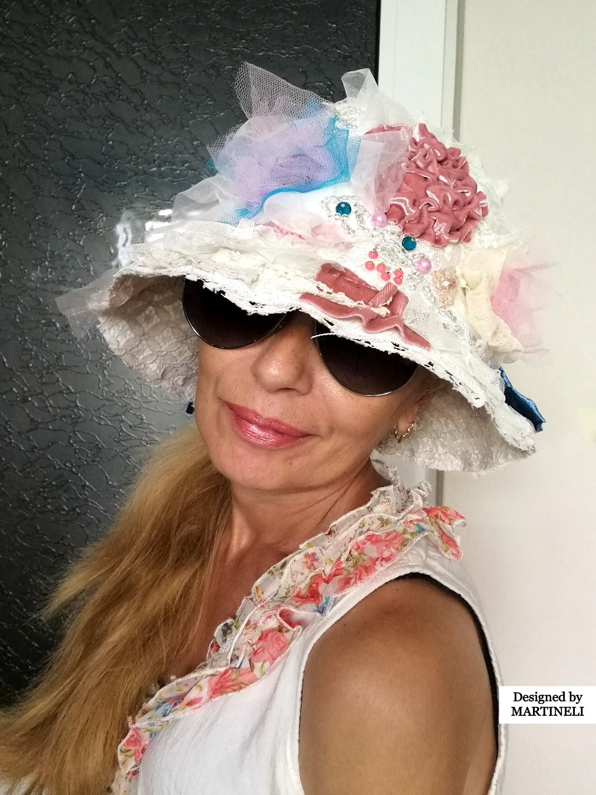 This floral summer hat is very lightweight, soft comfortable. This shabby chic hat has a fine cotton lining.