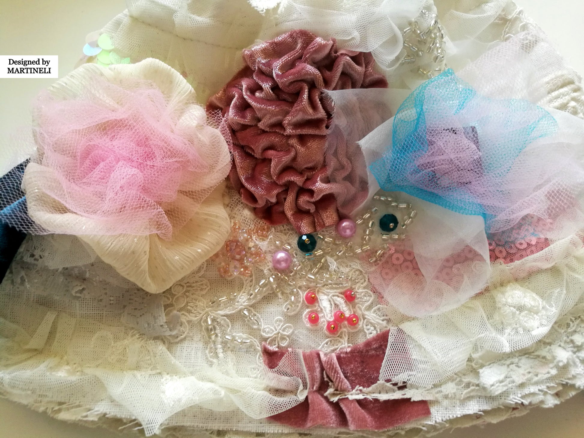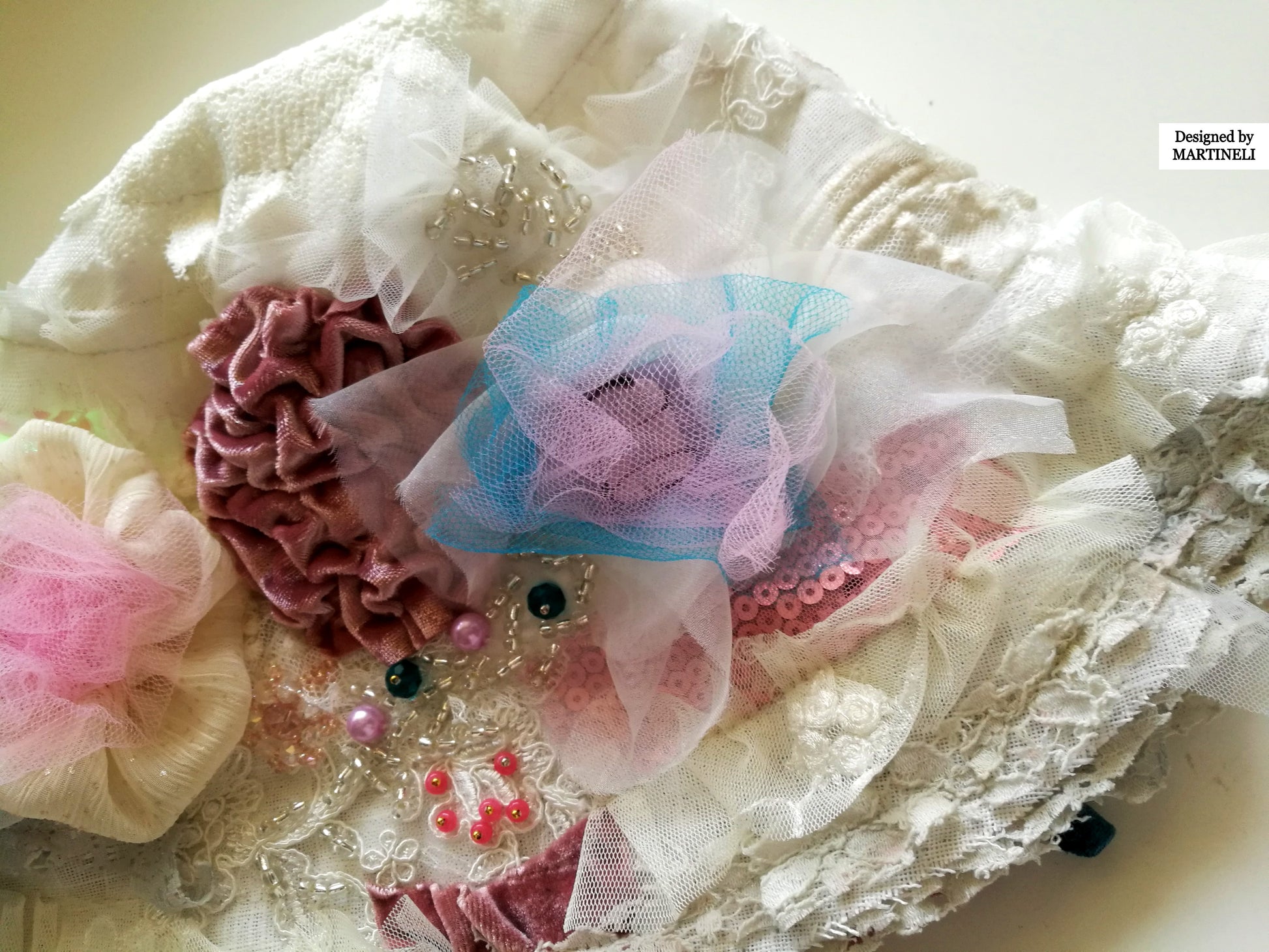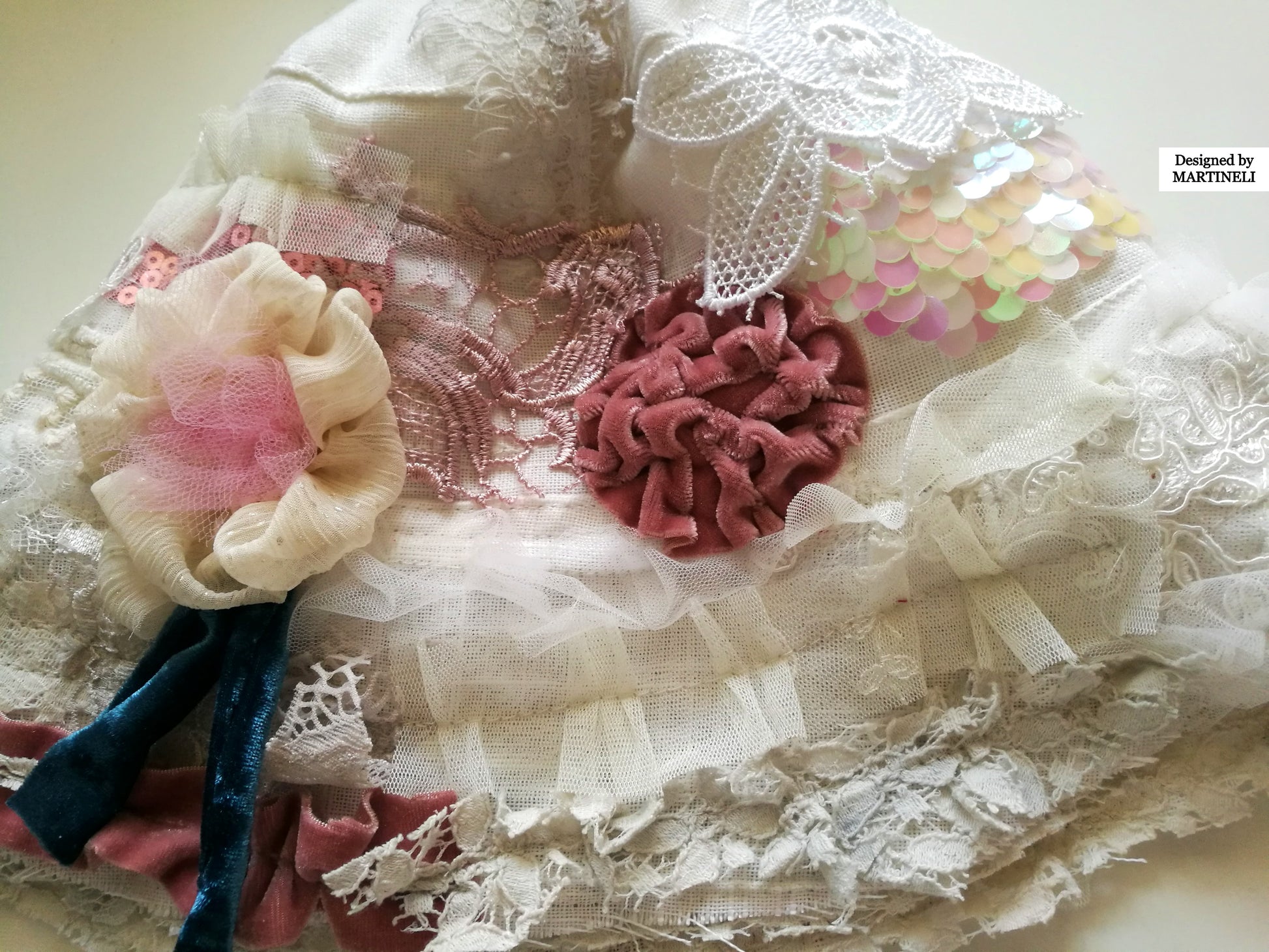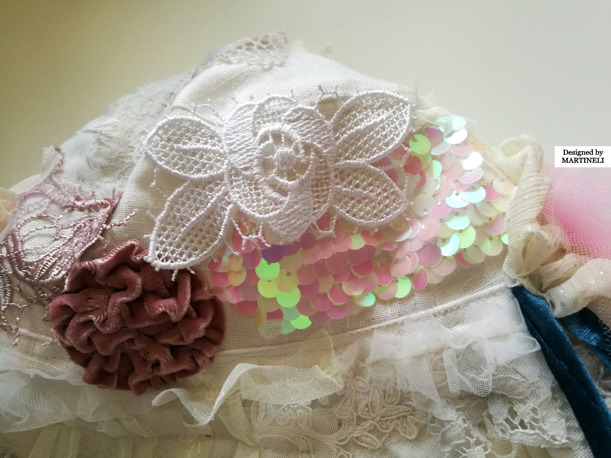 I used soft white linen fabric, different laces,velvet, tulle, sequins,Preciosa glass beads and pearls.