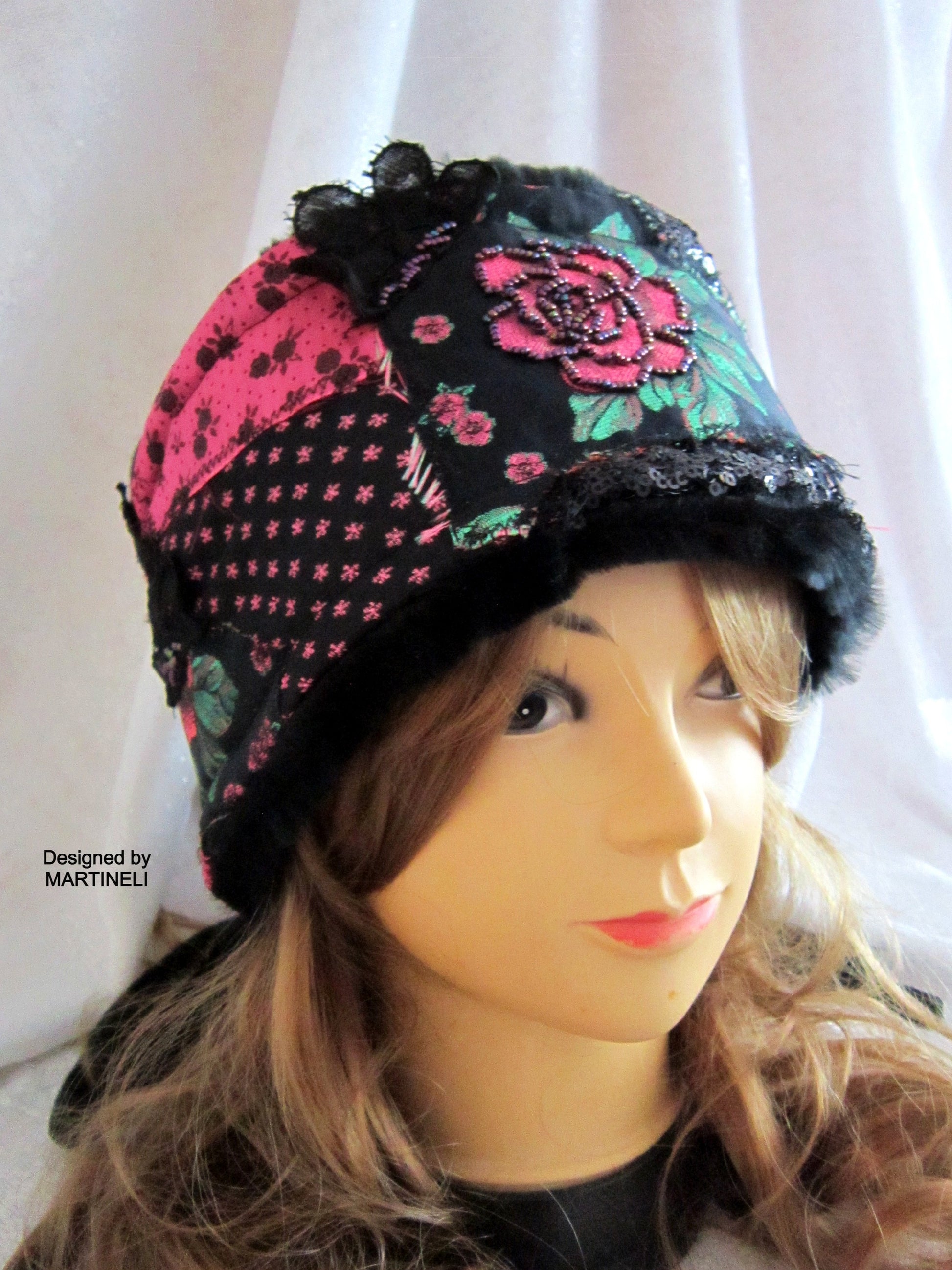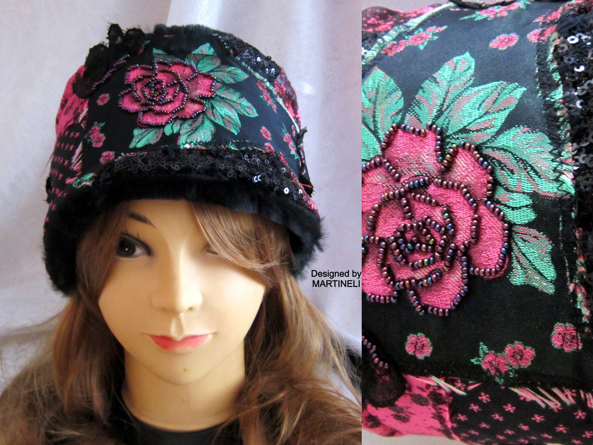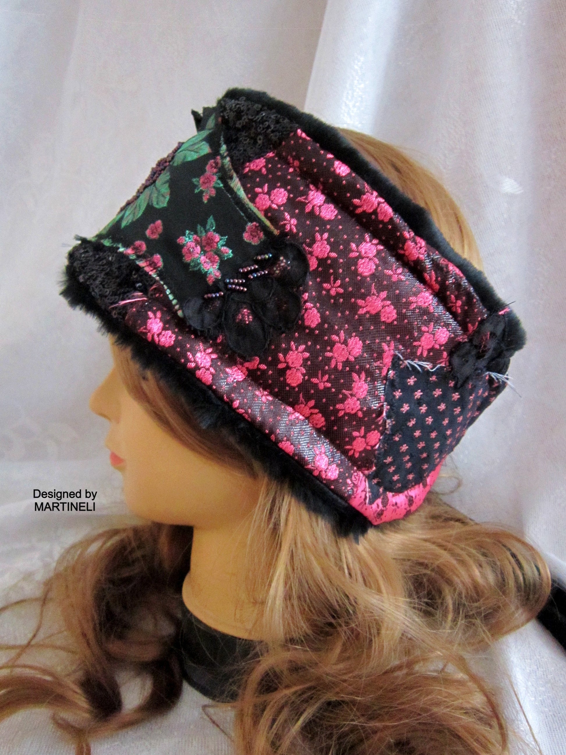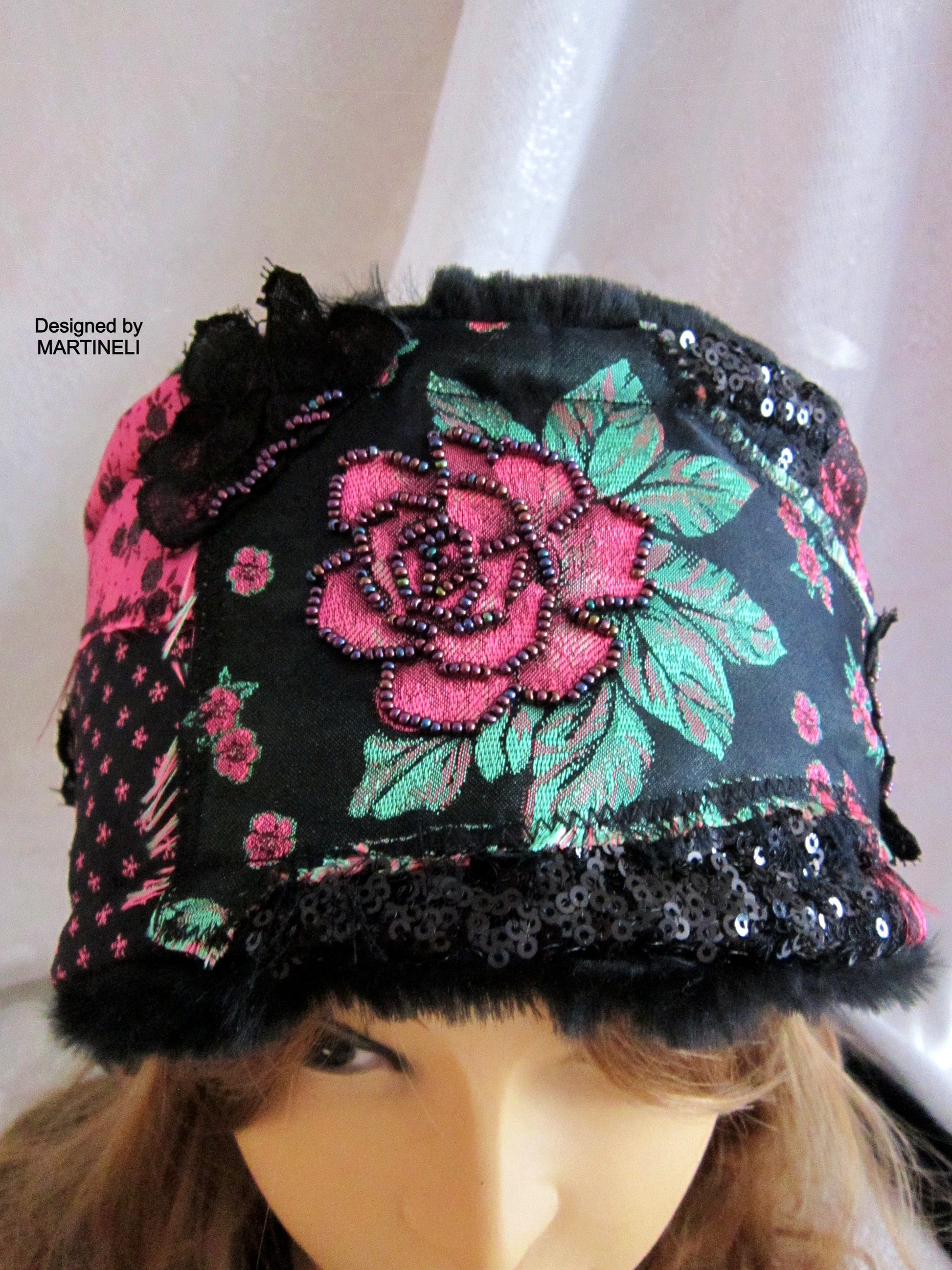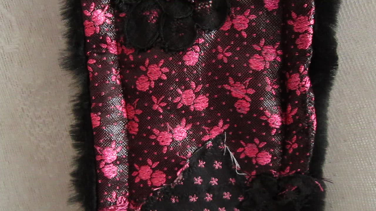 I used black tapestry with pink roses, black sequins fabric, lace, black faux fur,Preciosa Czech glass beads and crystals.