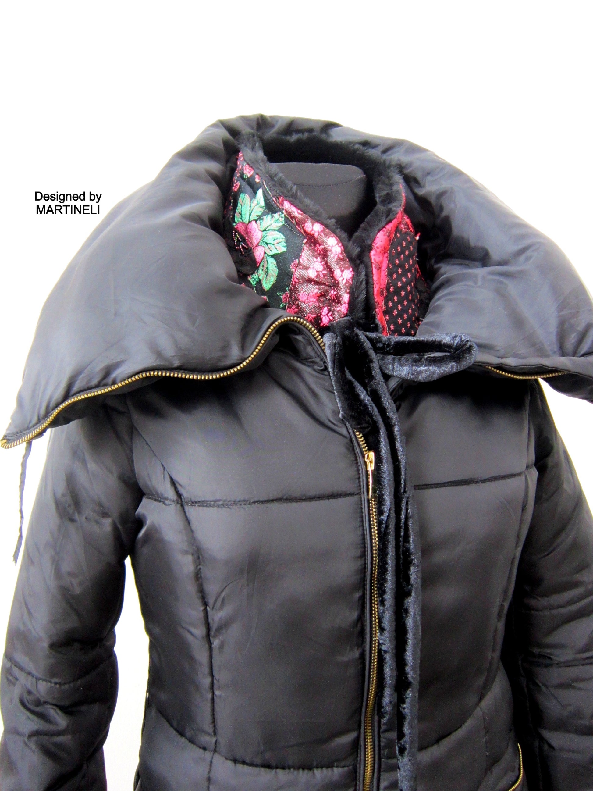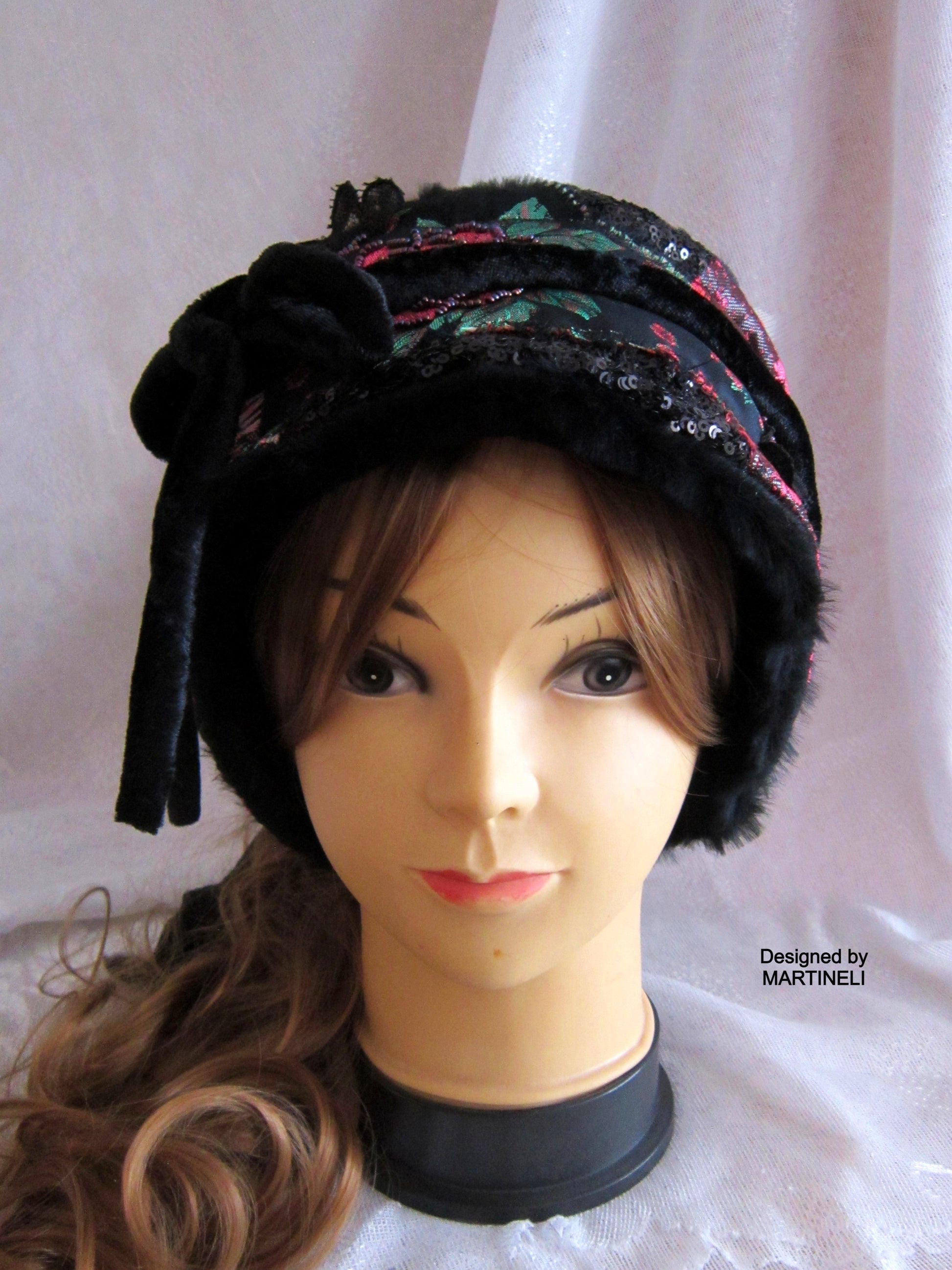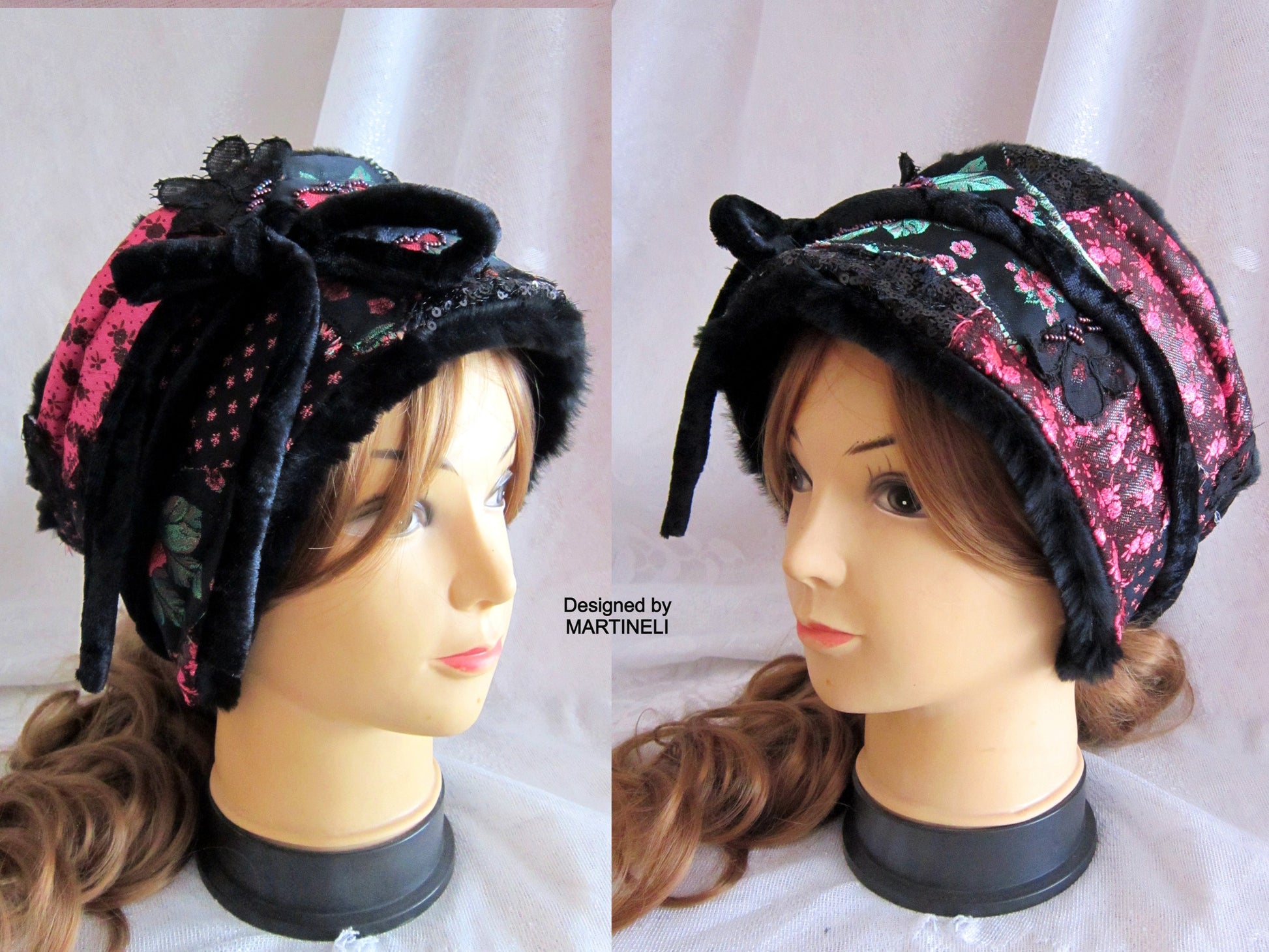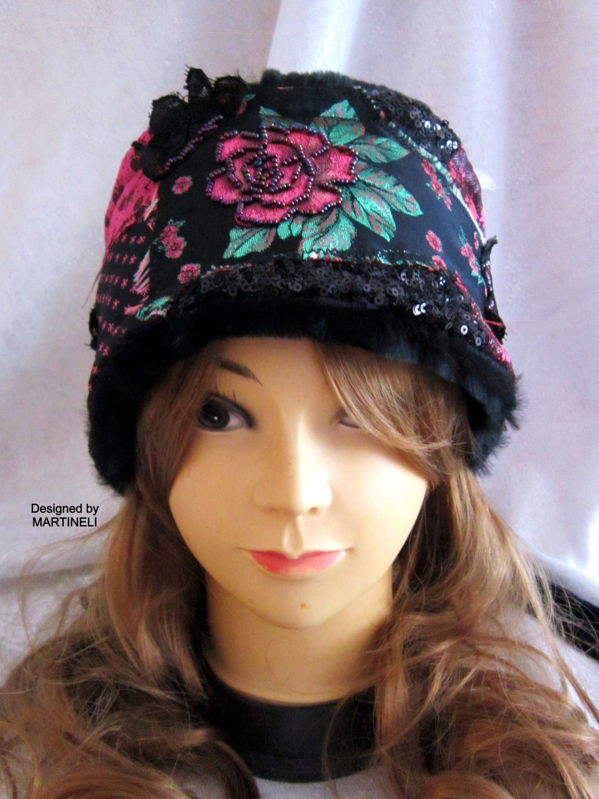I used black tapestry with pink roses, black sequins fabric, lace, black faux fur,Preciosa Czech glass beads and crystals.