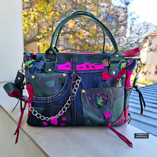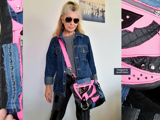 Pink Leather Cross body Bag Italian Leather and Denim Shoulder Purse Bag