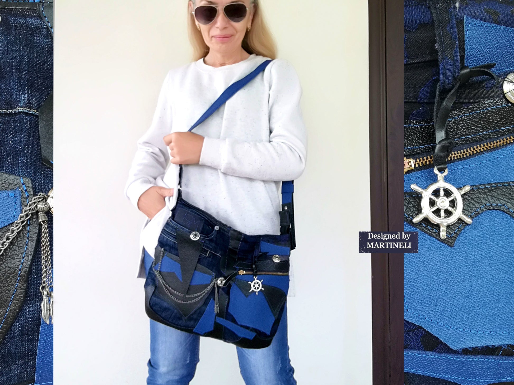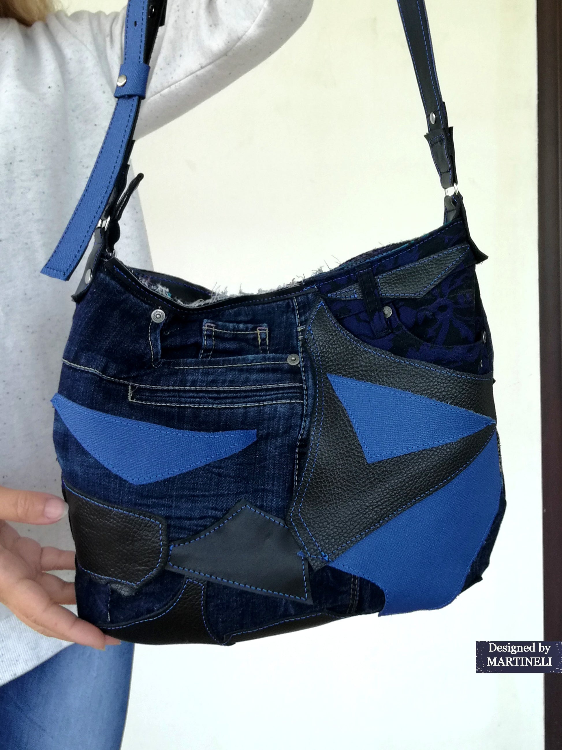 I used new Italian leather- BLACK and BLUE, different nuances of blue denim, printed cotton blend lining.