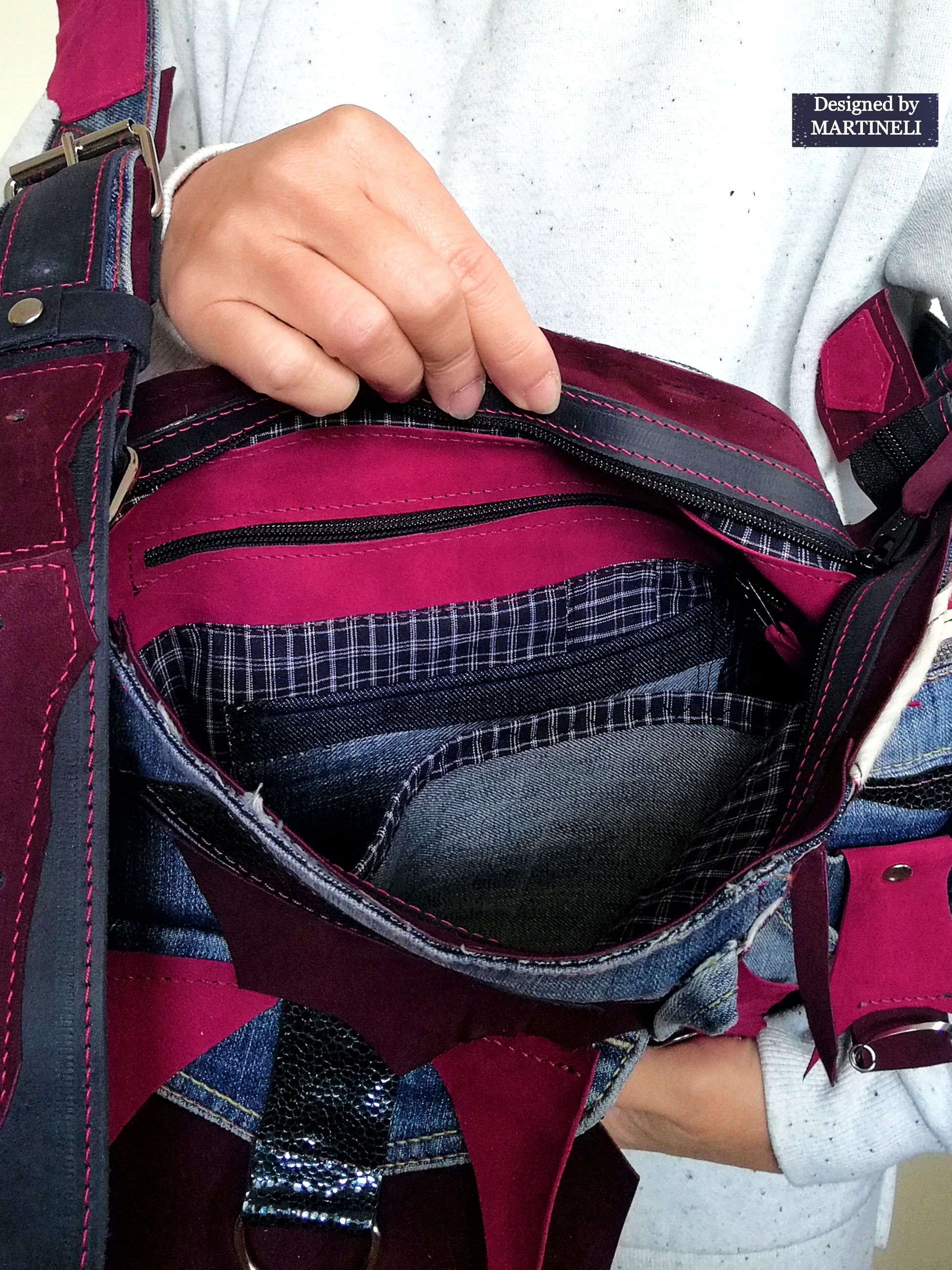 I used new Italian leather- STRAWBERRY PINK,dark wine red,dark blue leather , animal print FURRY leather, blue denim,plaid cotton lining.