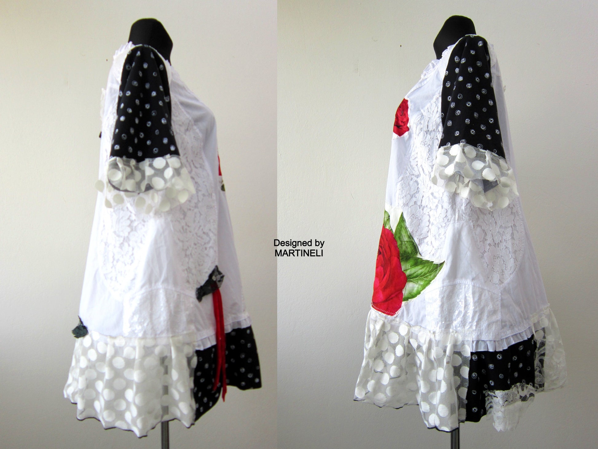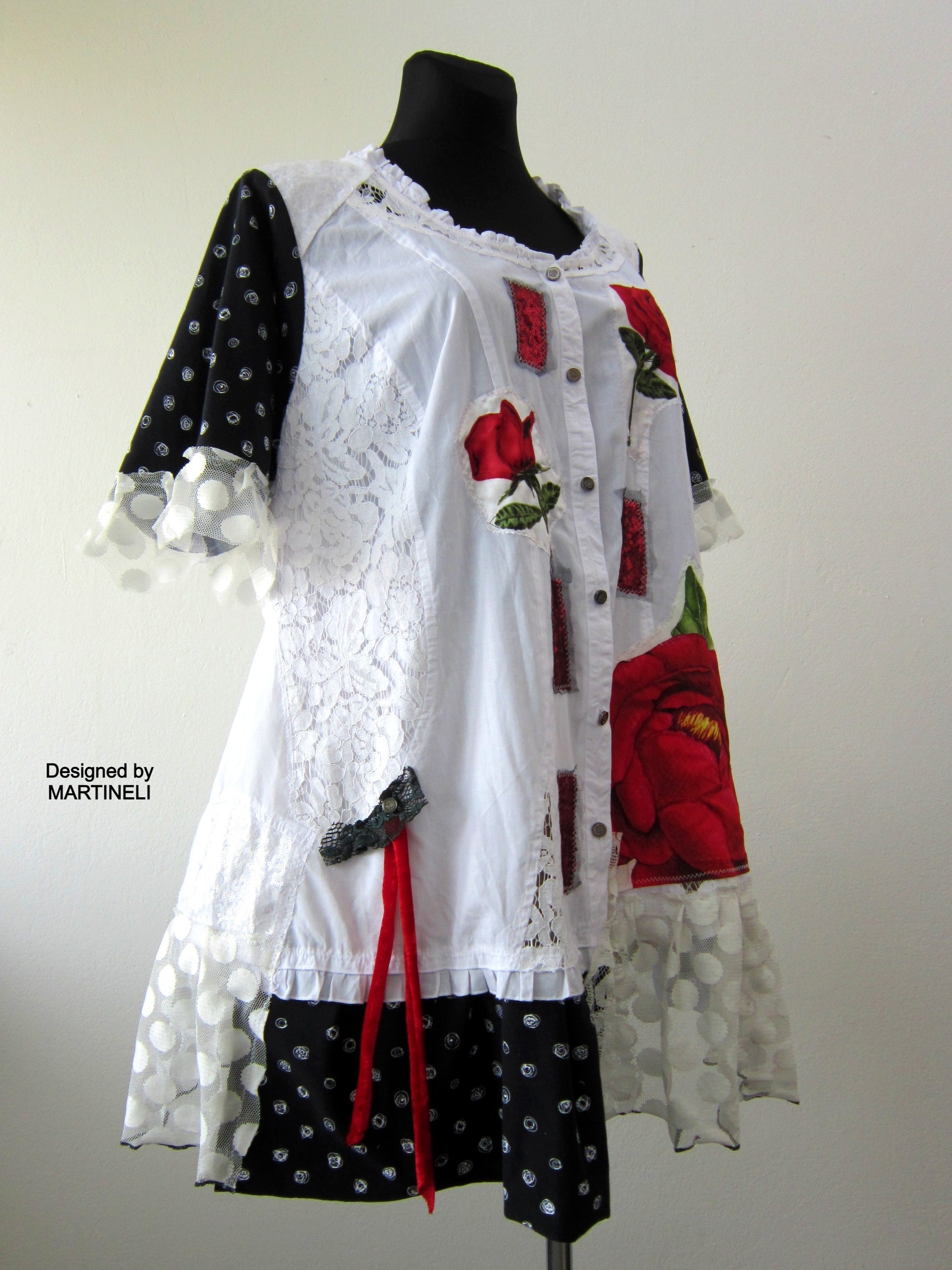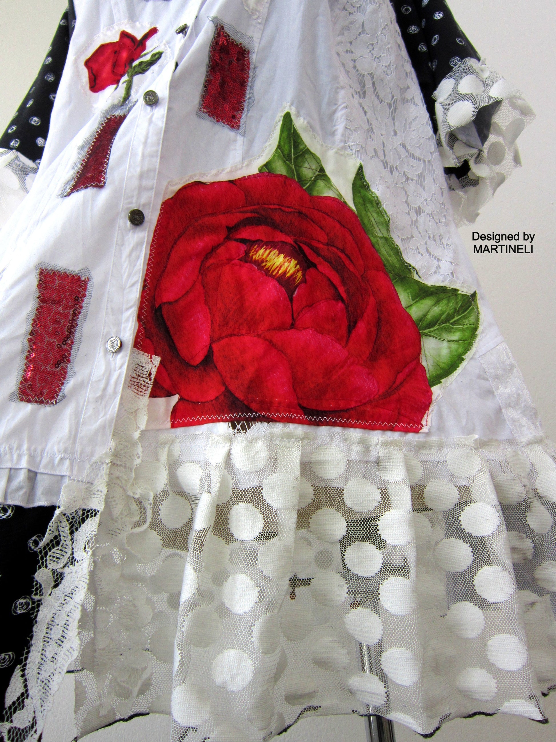 I used NEW white cotton shirt with white lace and white sequins,NEW black abstract polka dot print stretchy cotton, laces, white polka dot net fabric,red sequins patches,red roses patches.