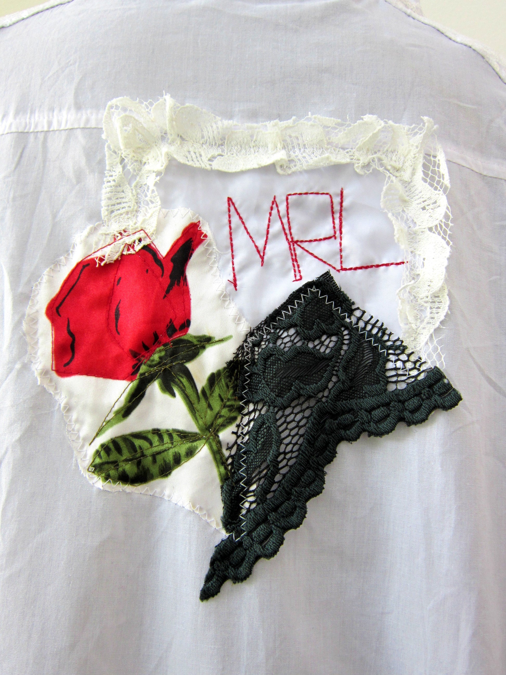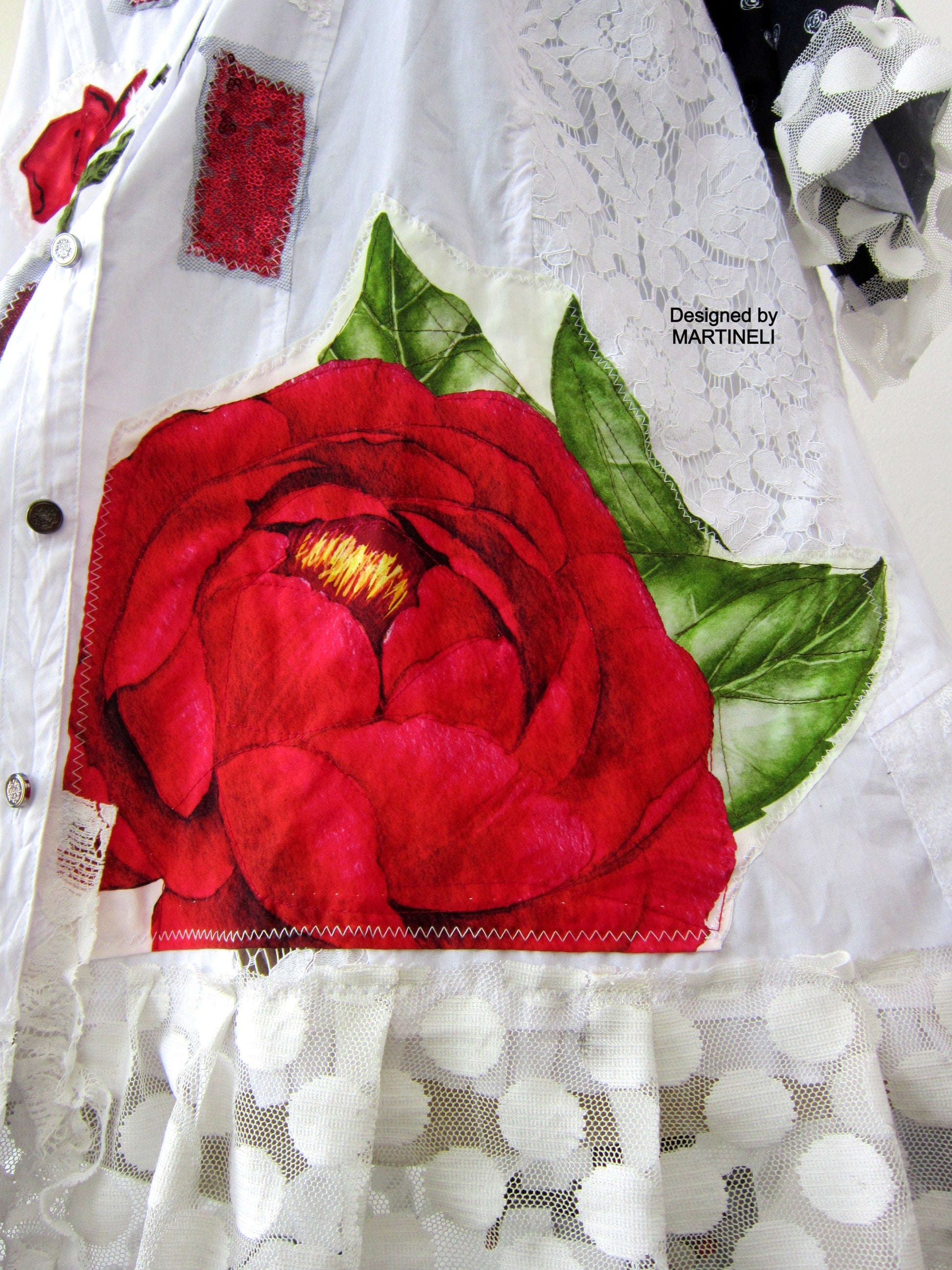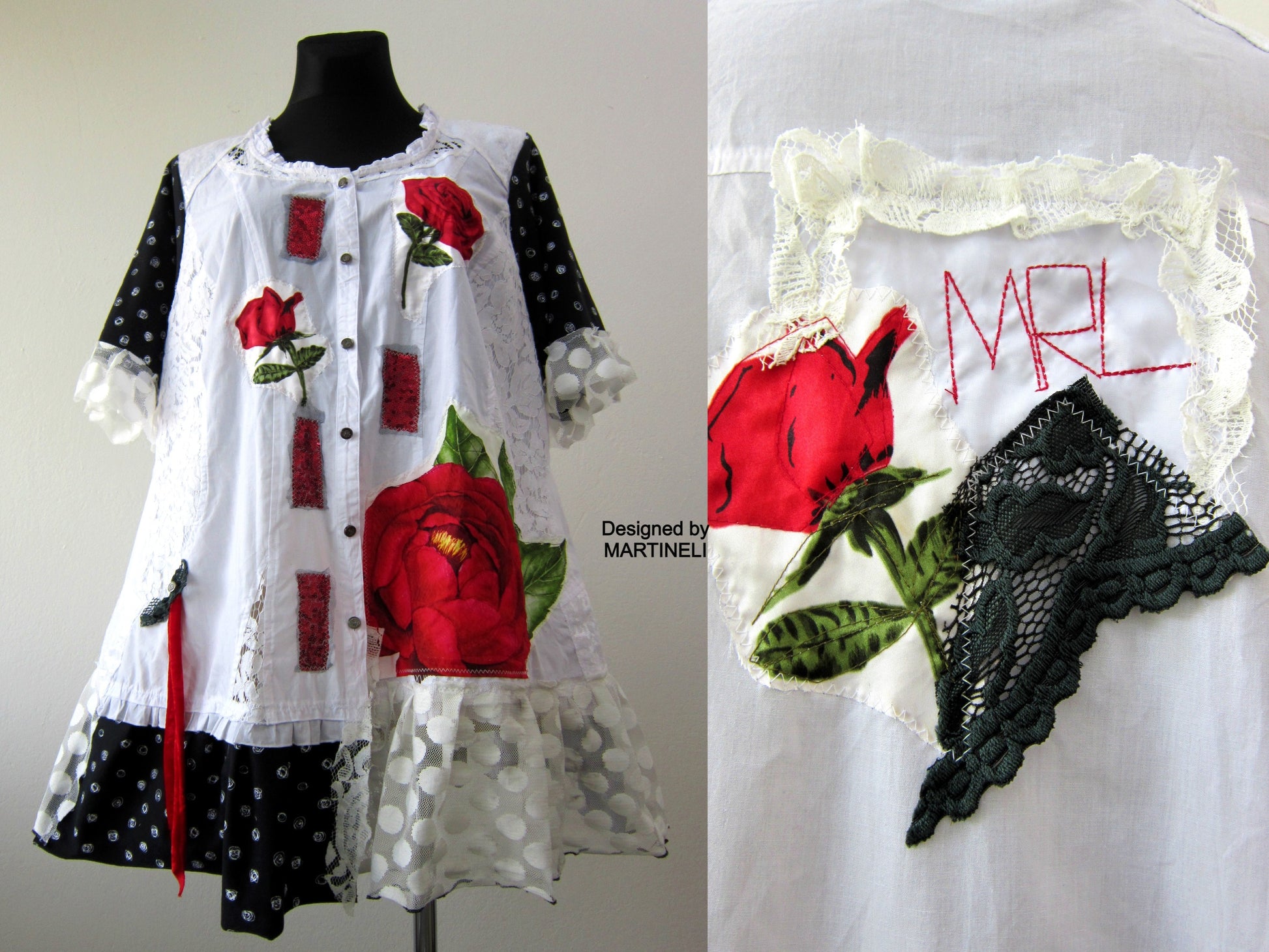 I used NEW white cotton shirt with white lace and white sequins,NEW black abstract polka dot print stretchy cotton, laces, white polka dot net fabric,red sequins patches,red roses patches.