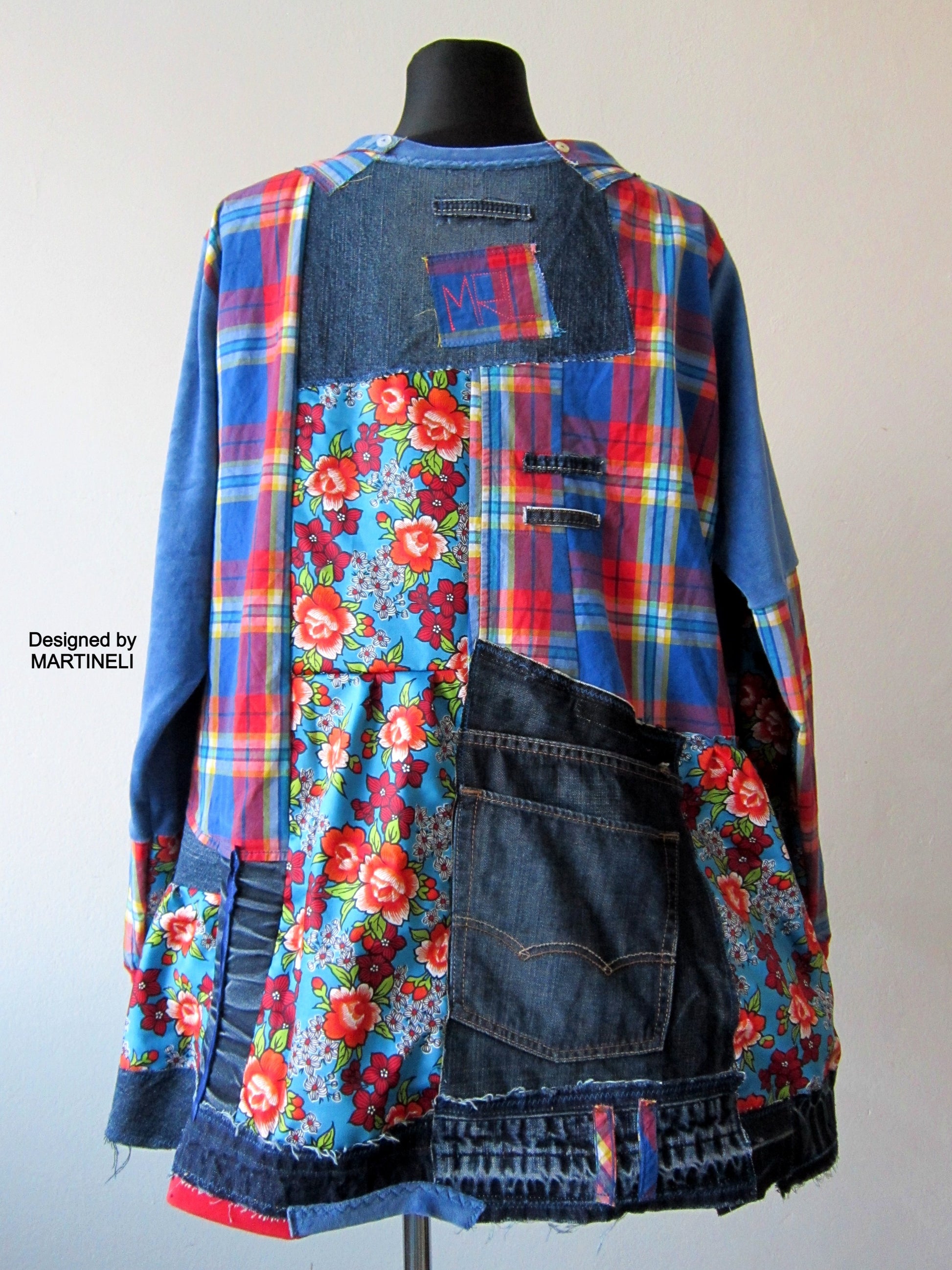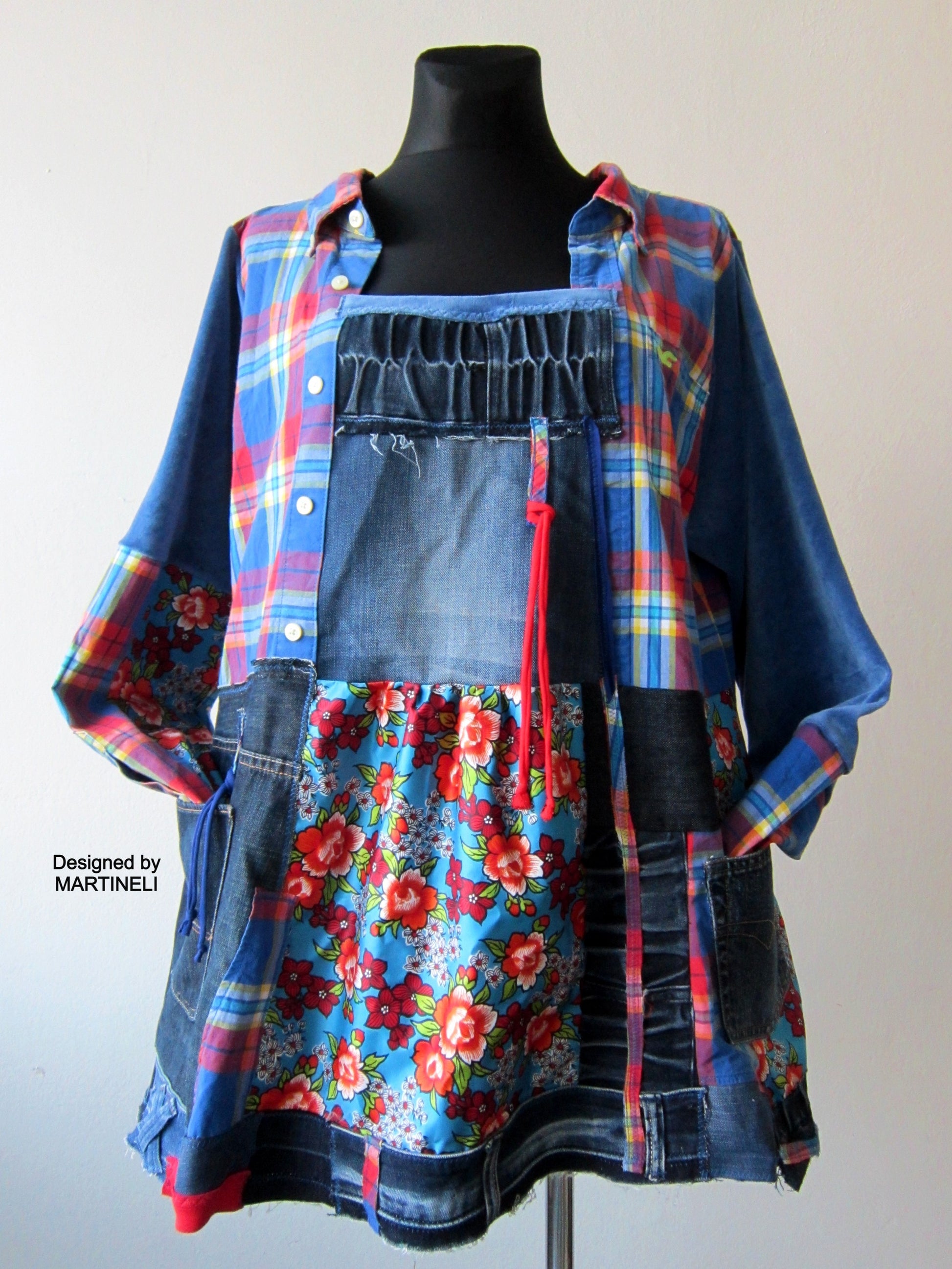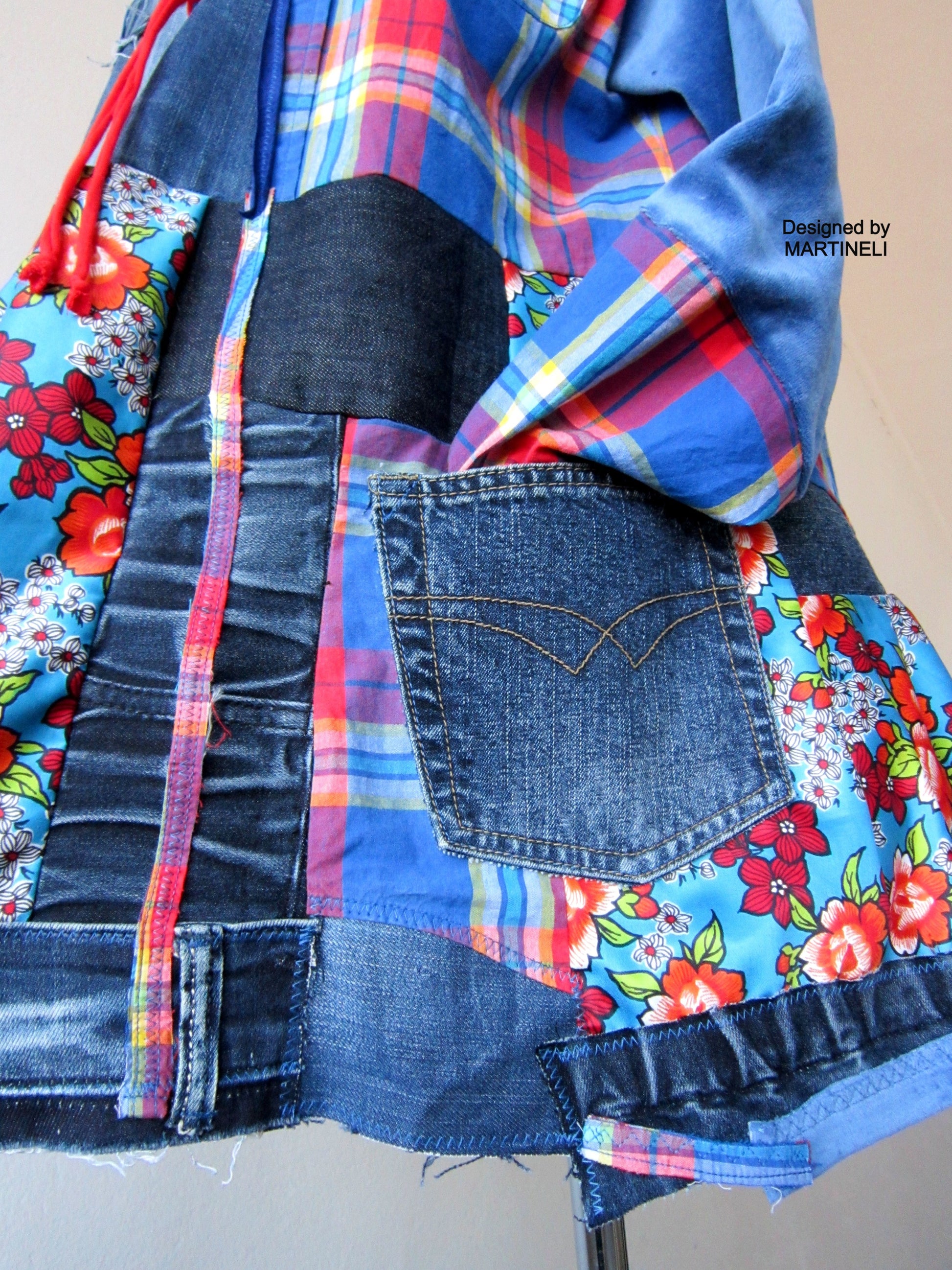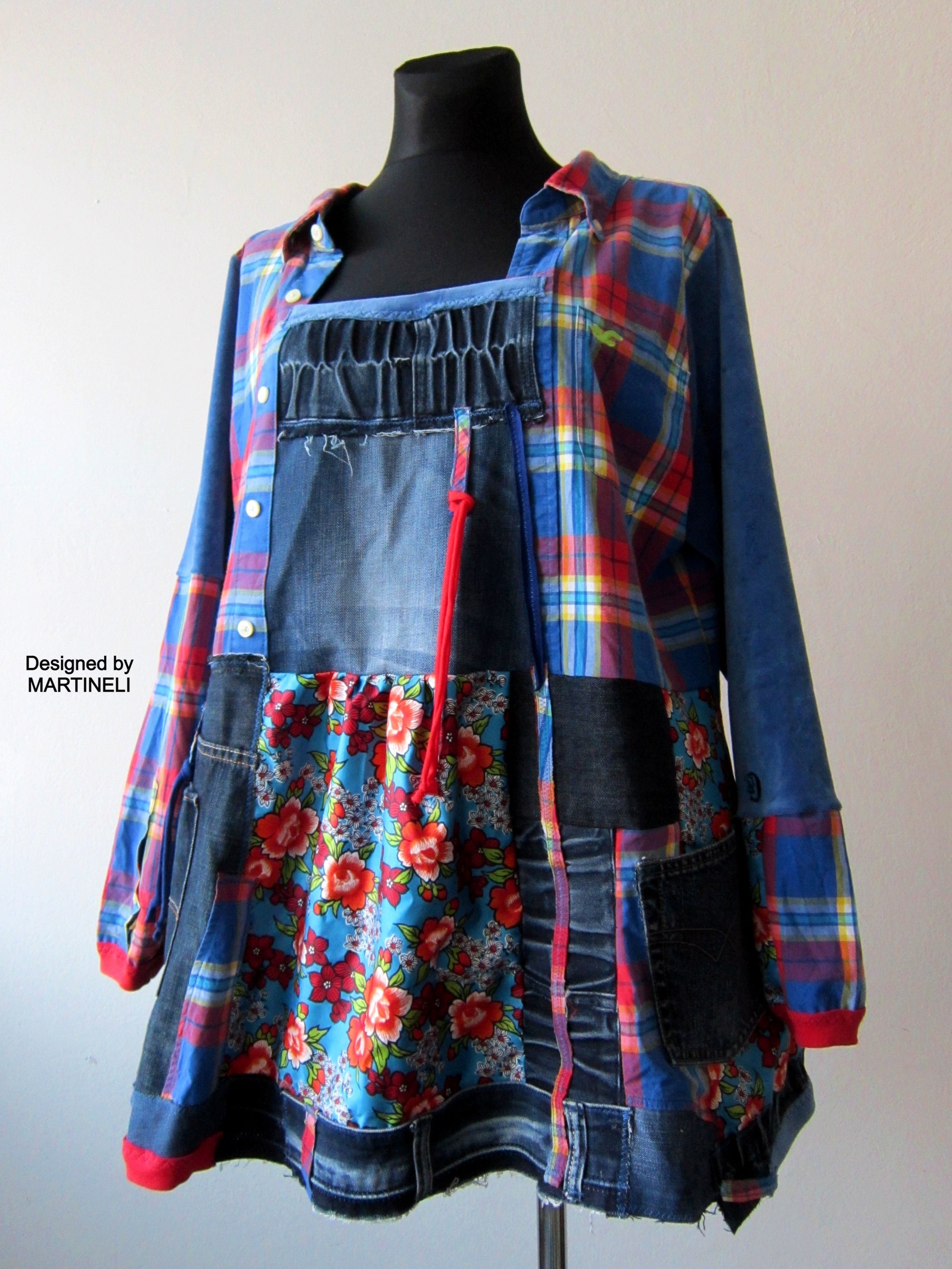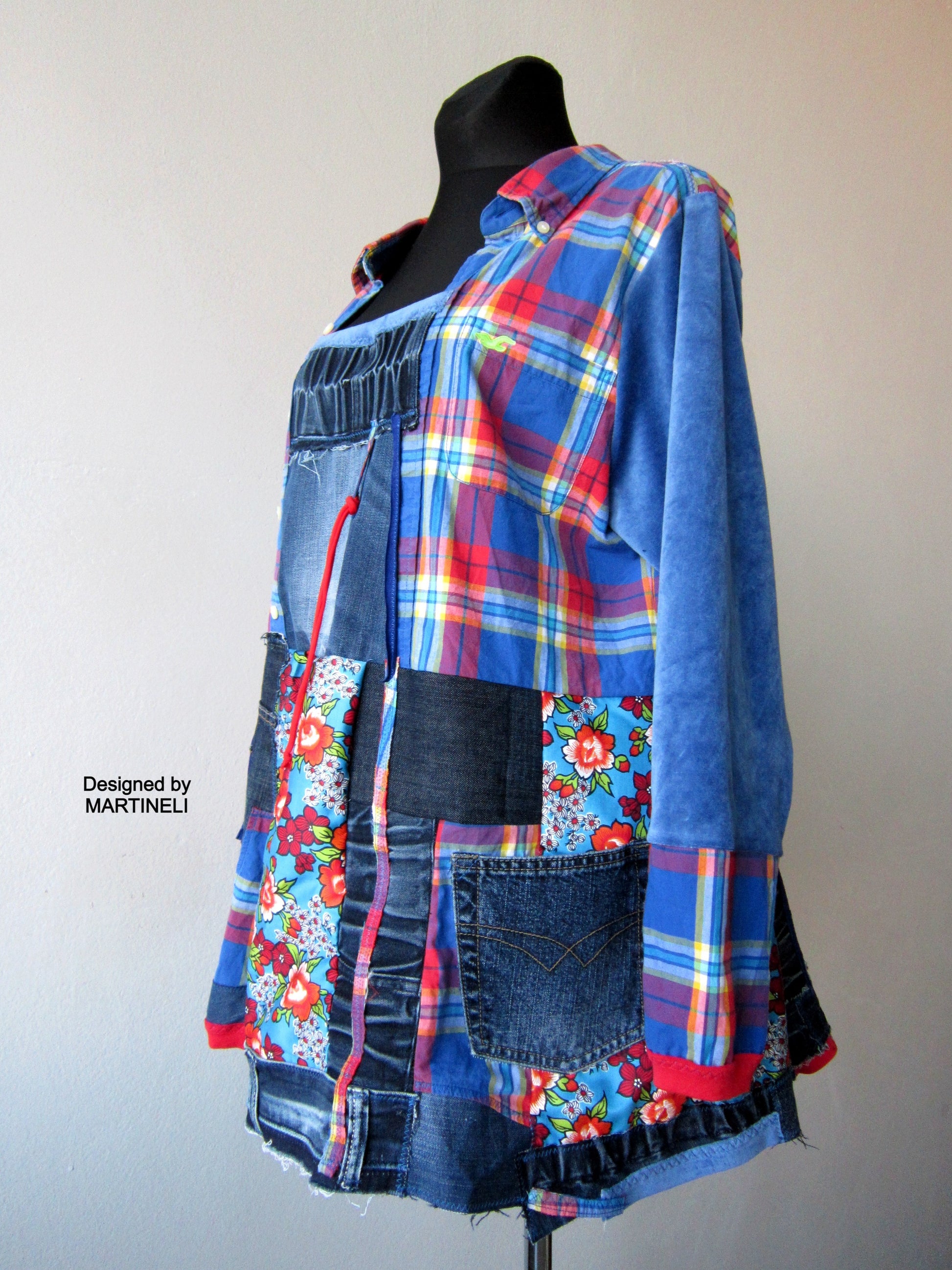 I used very soft stretchy blue plush cotton ,cotton plaid shirt in blue/red/yellow,nuances of dark blue denim,floral cotton fabric.