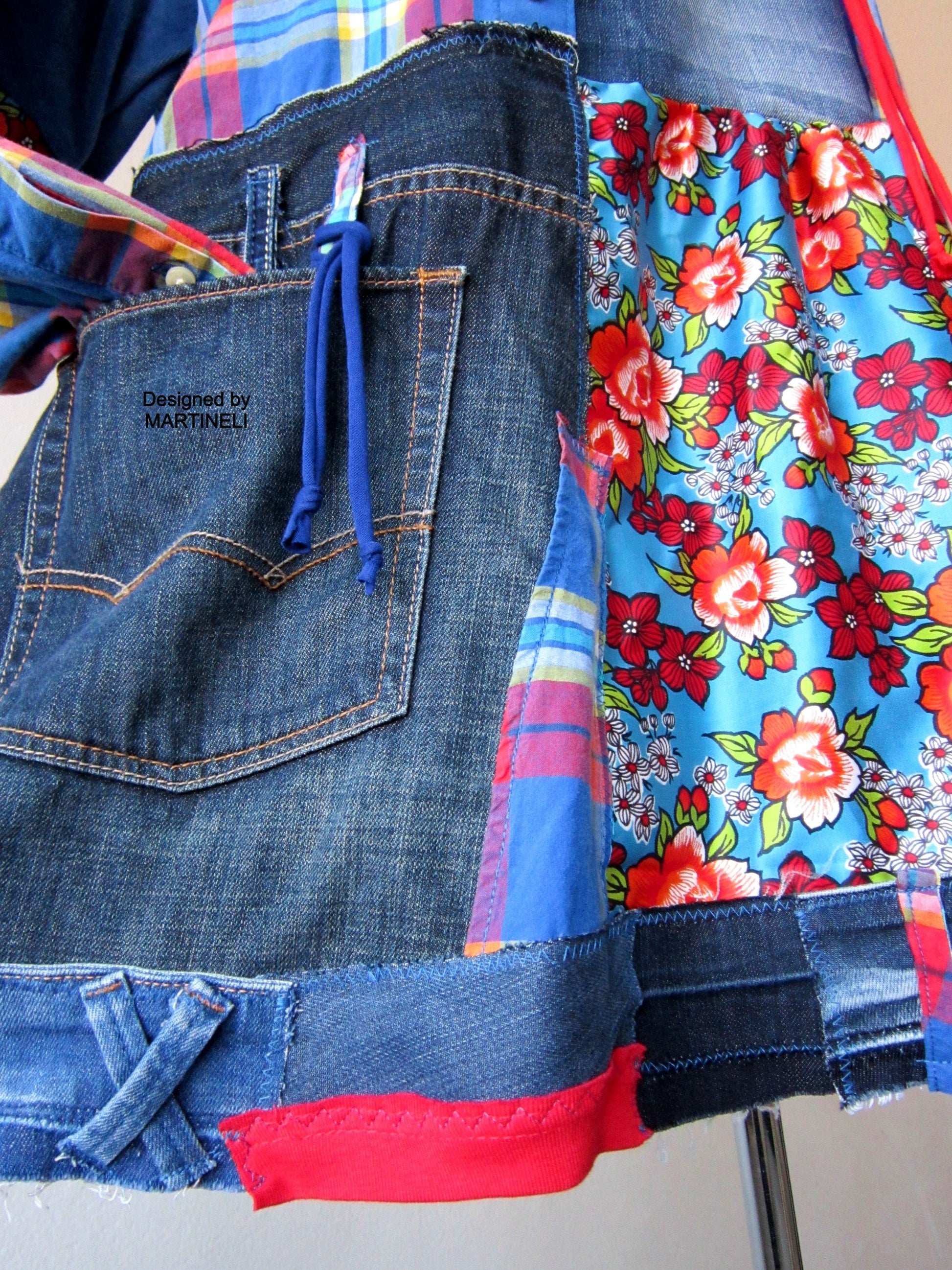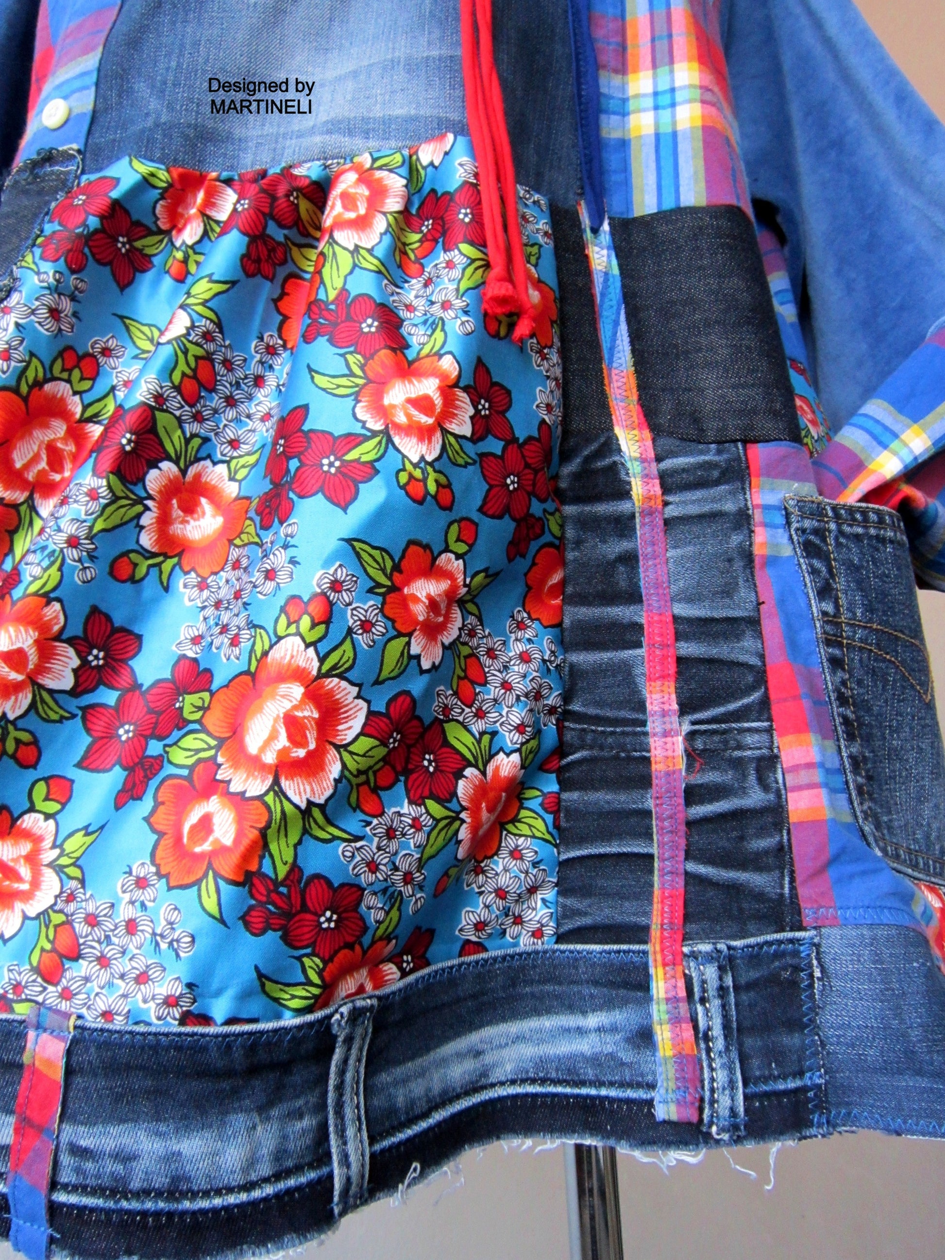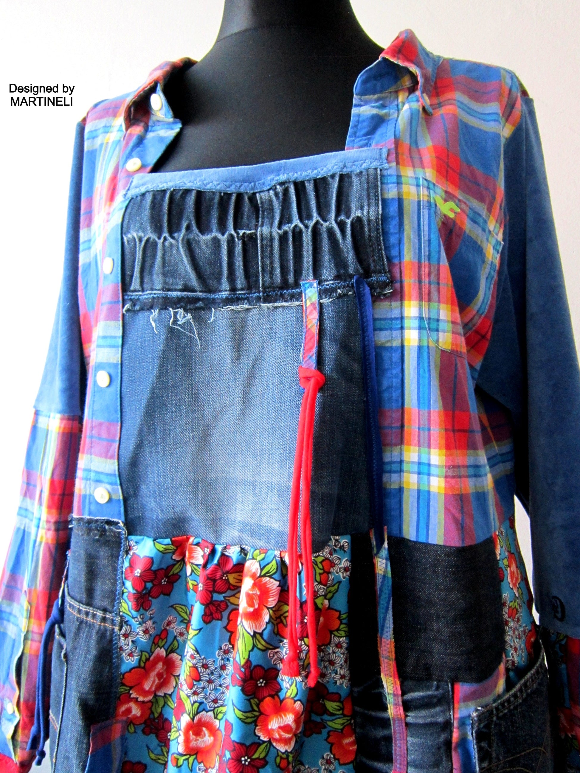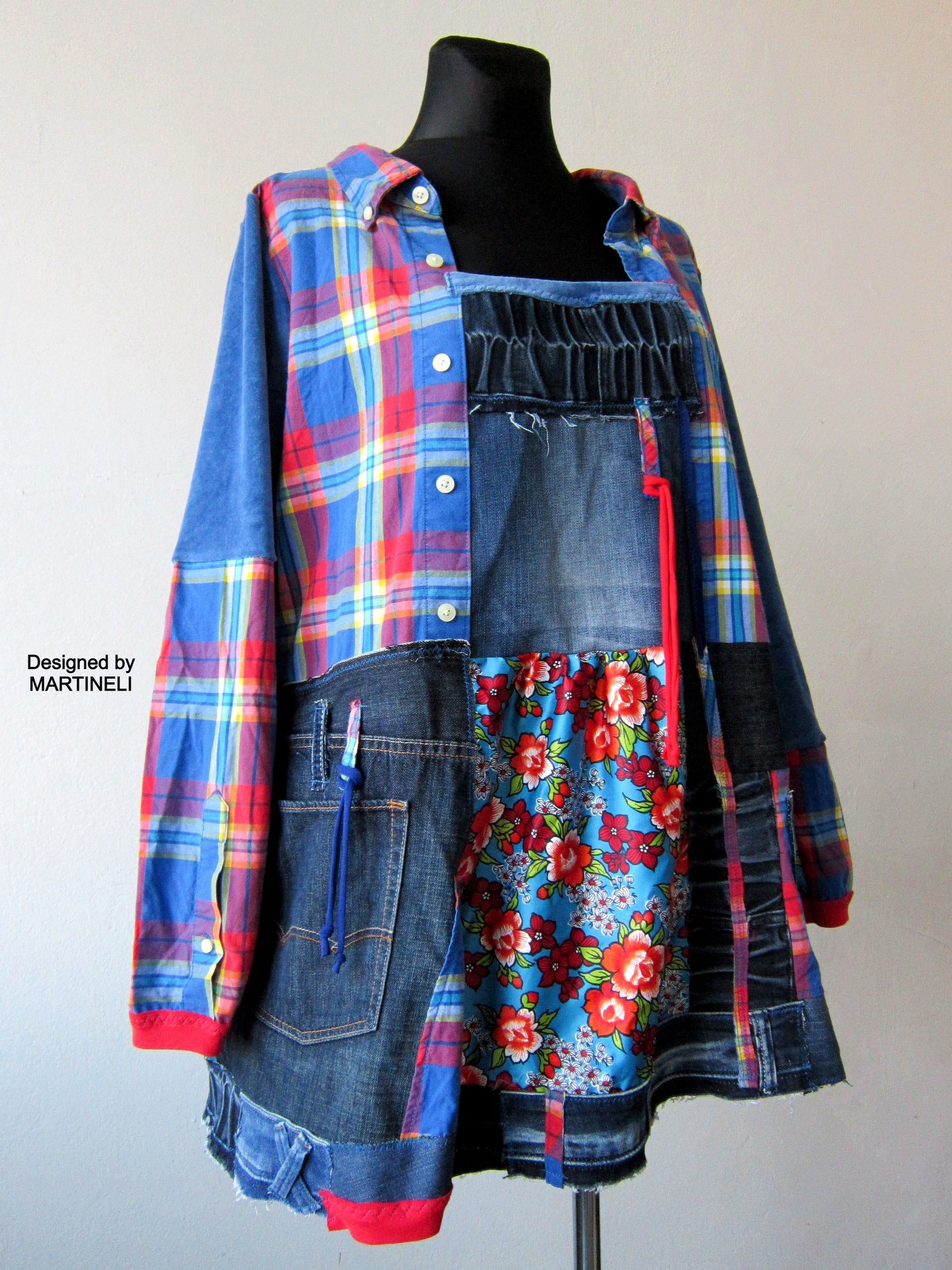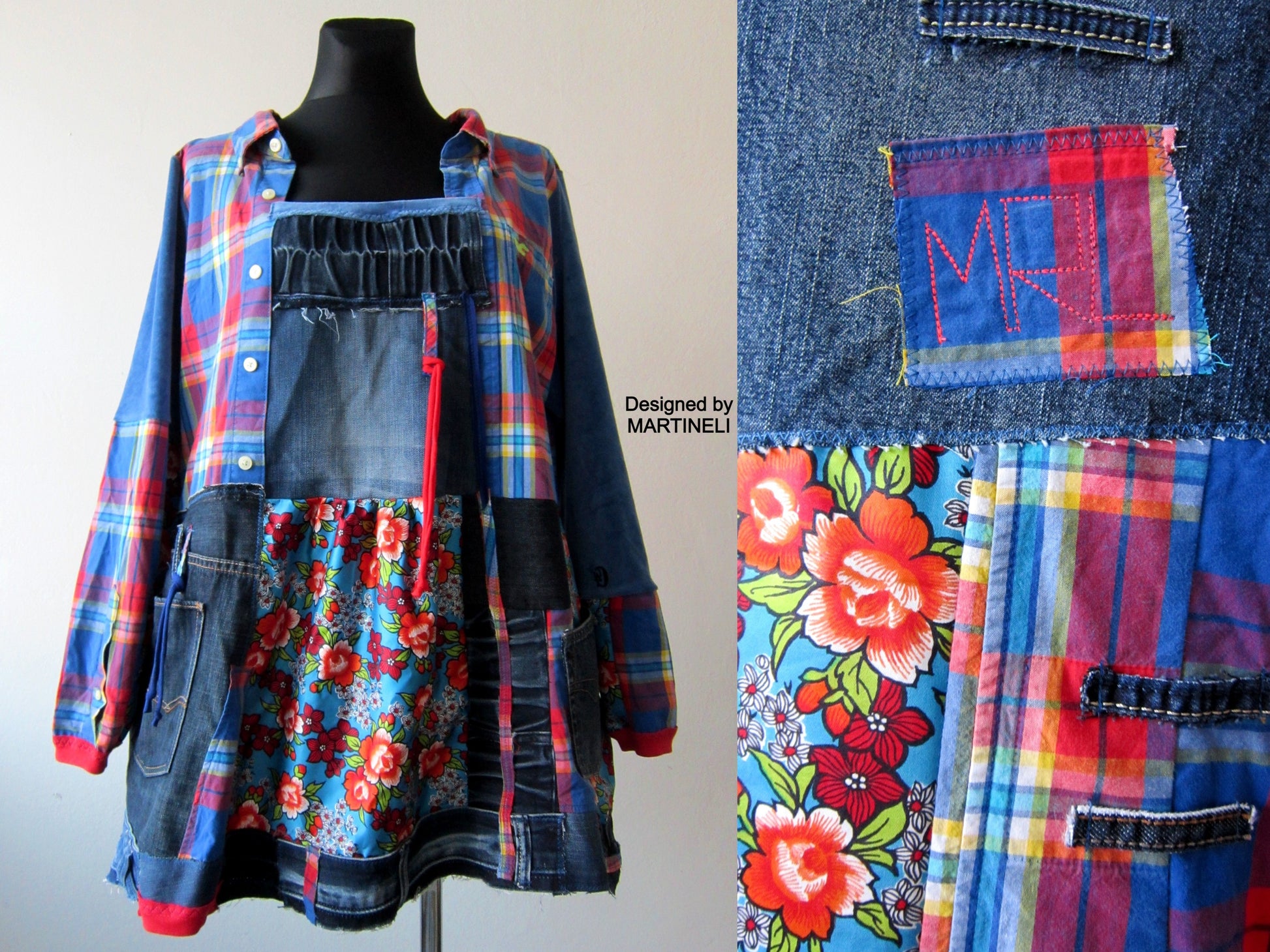 I used very soft stretchy blue plush cotton ,cotton plaid shirt in blue/red/yellow,nuances of dark blue denim,floral cotton fabric.