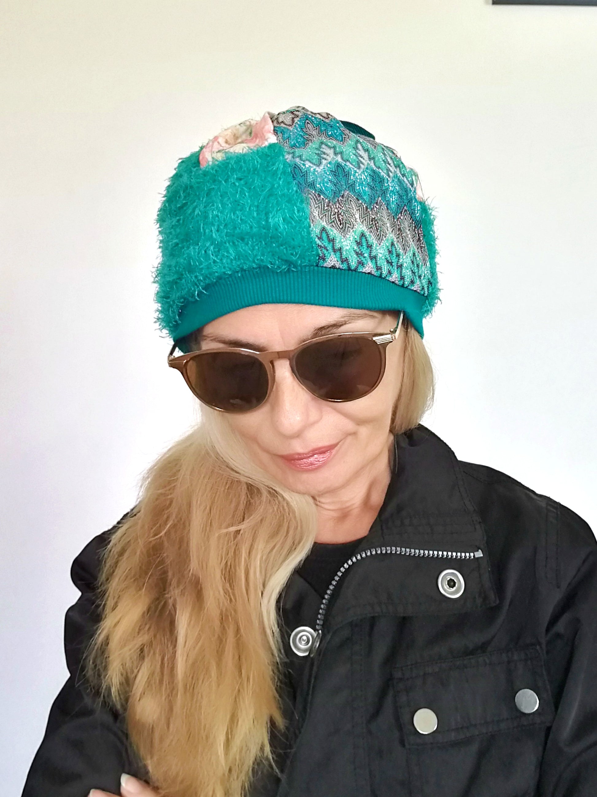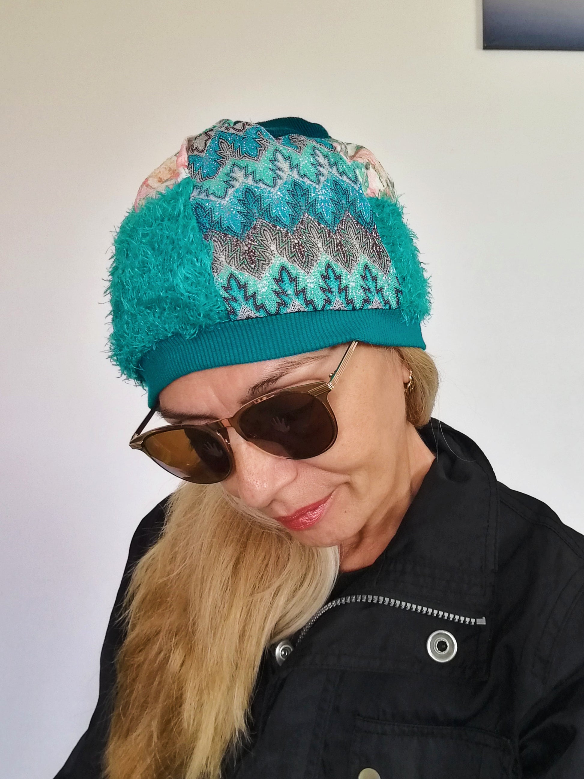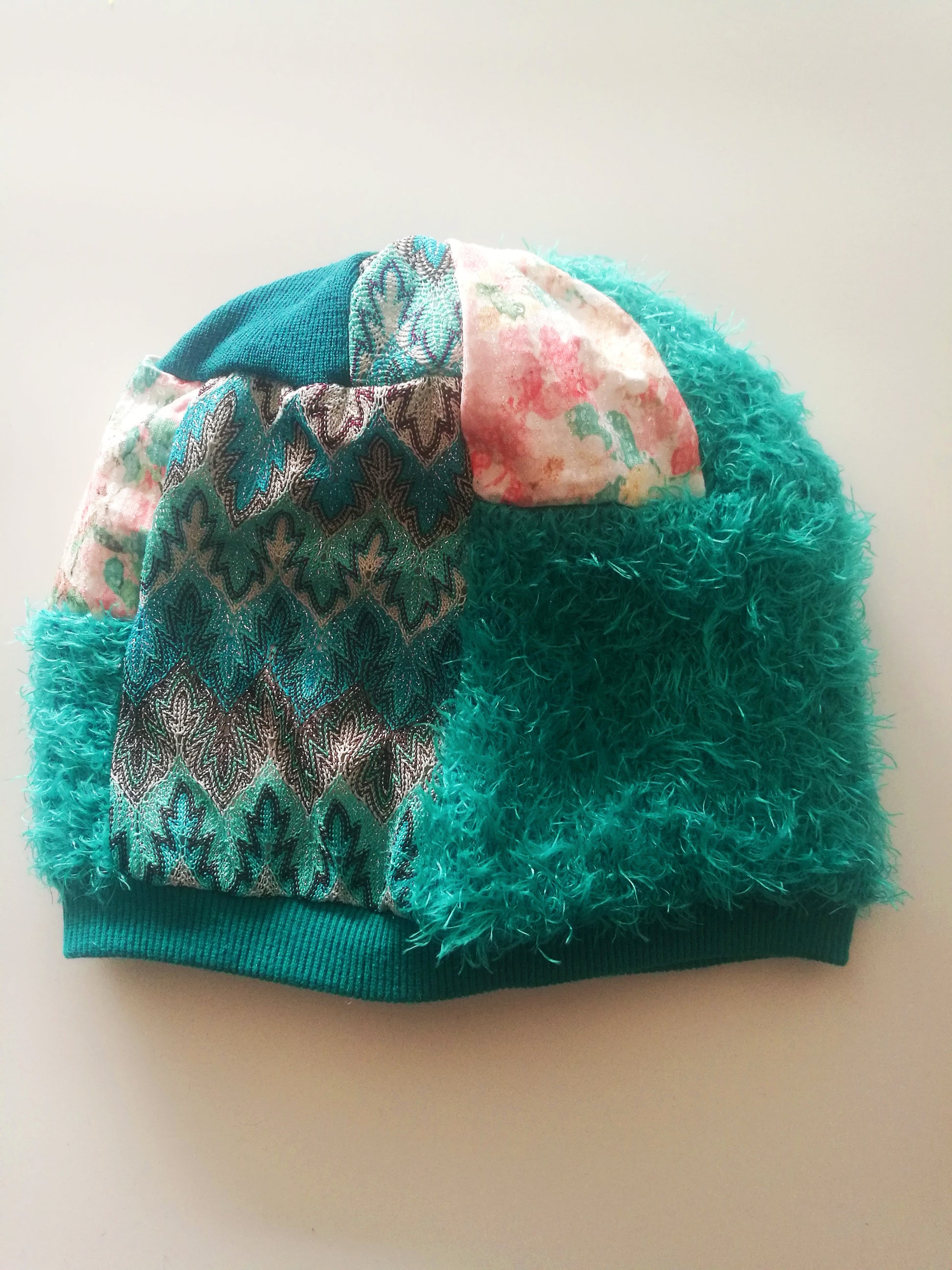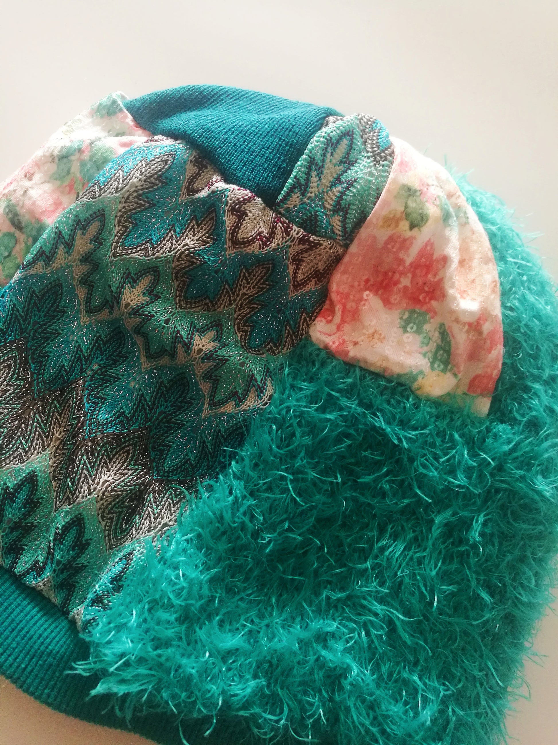 This turquoise patchwork beanie hat is designed and handmade by me.