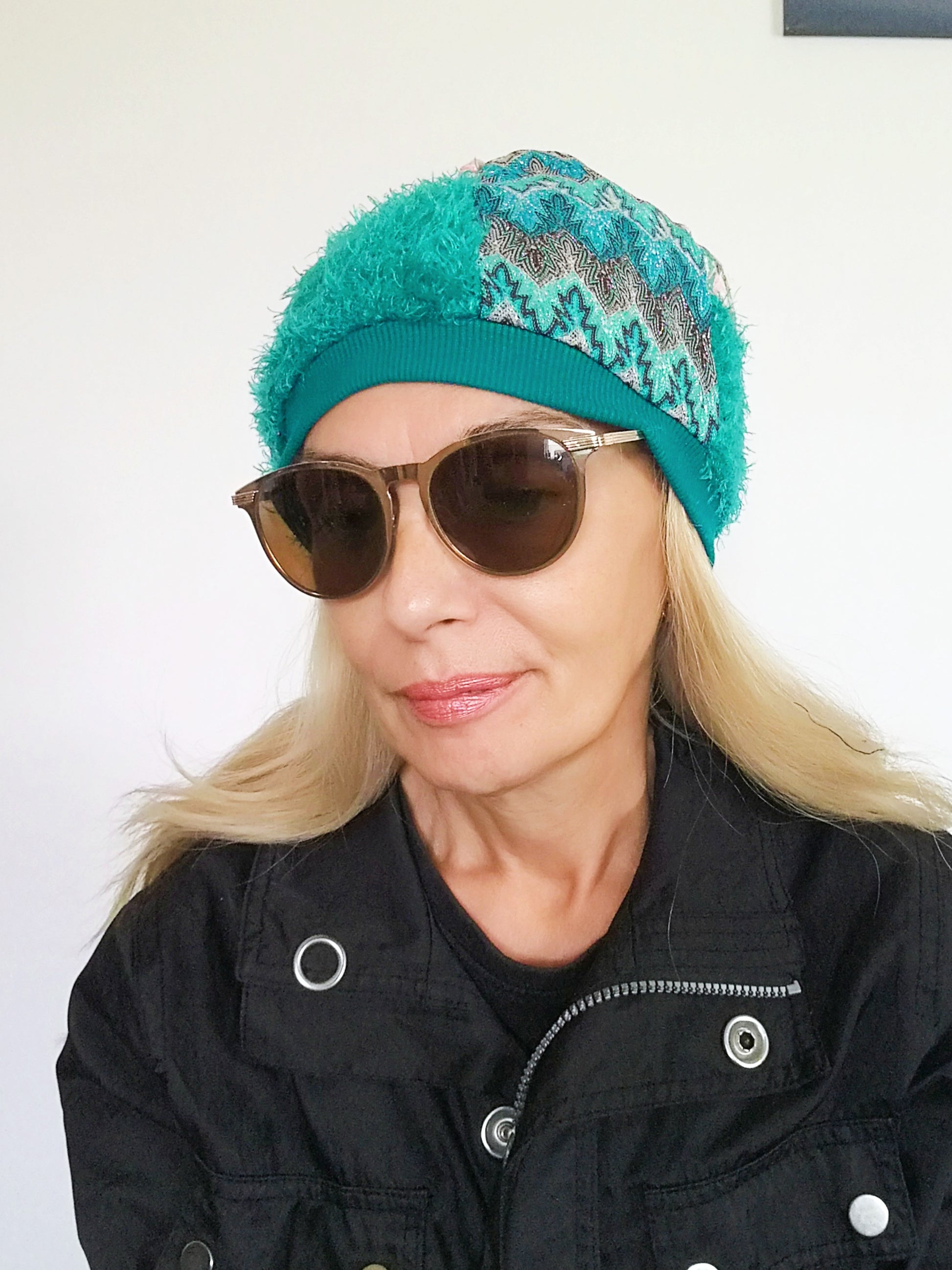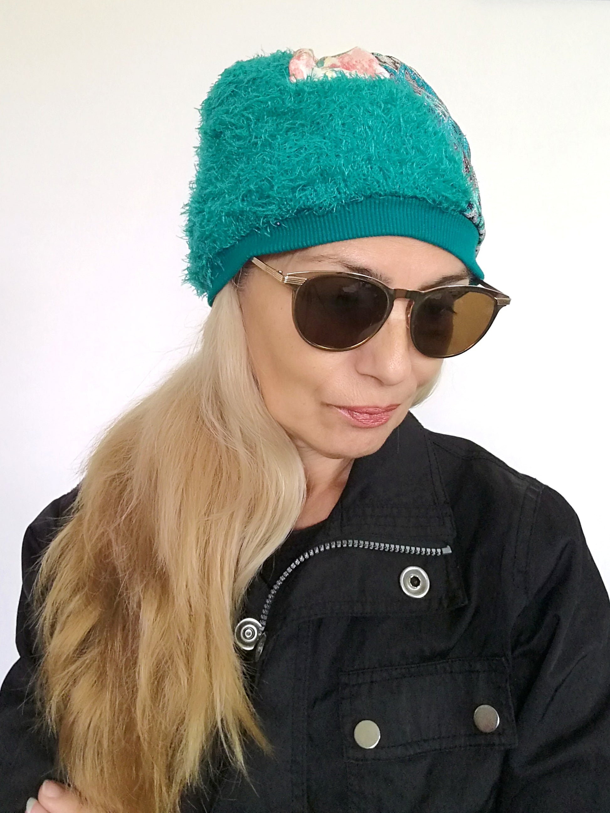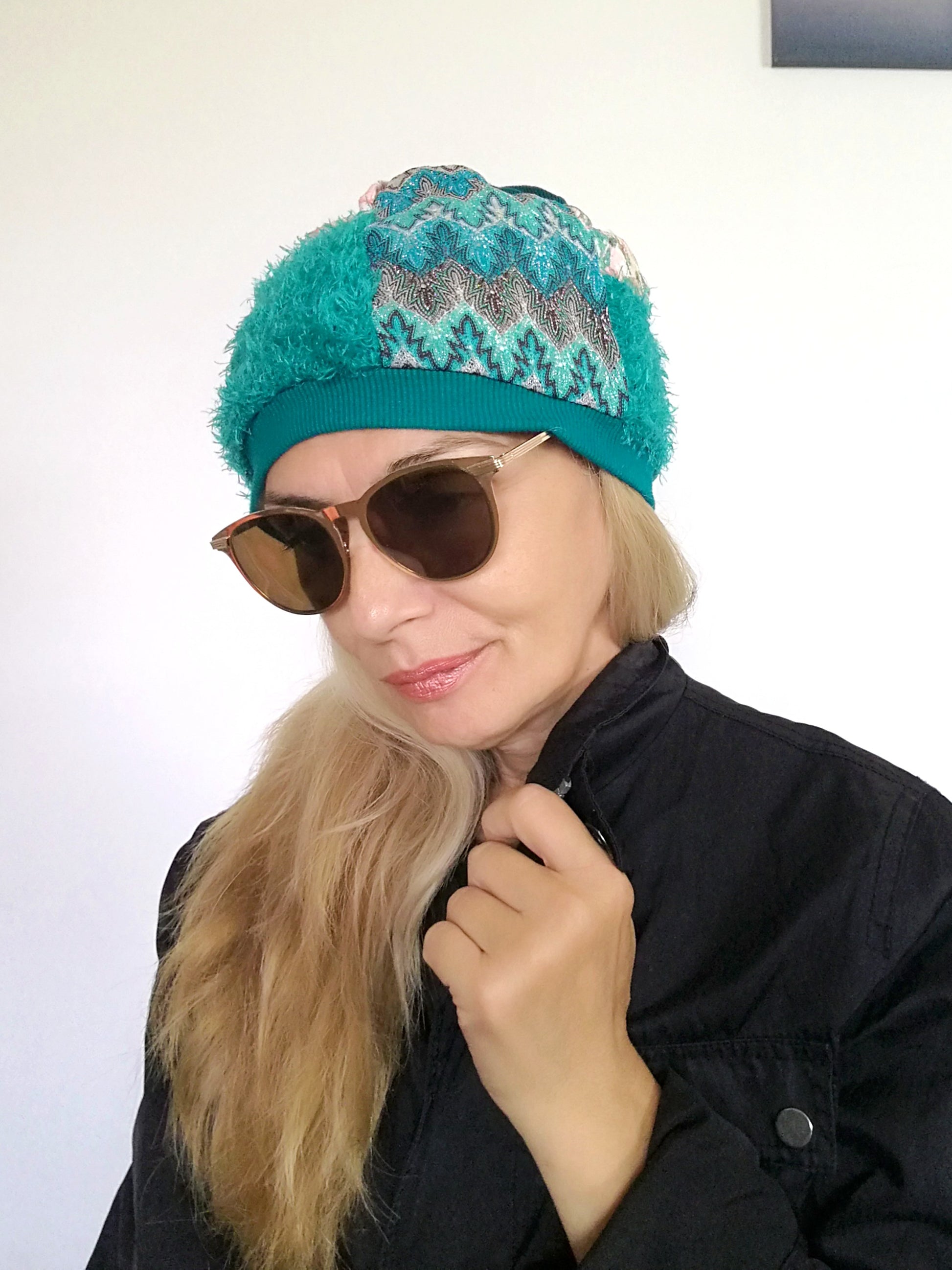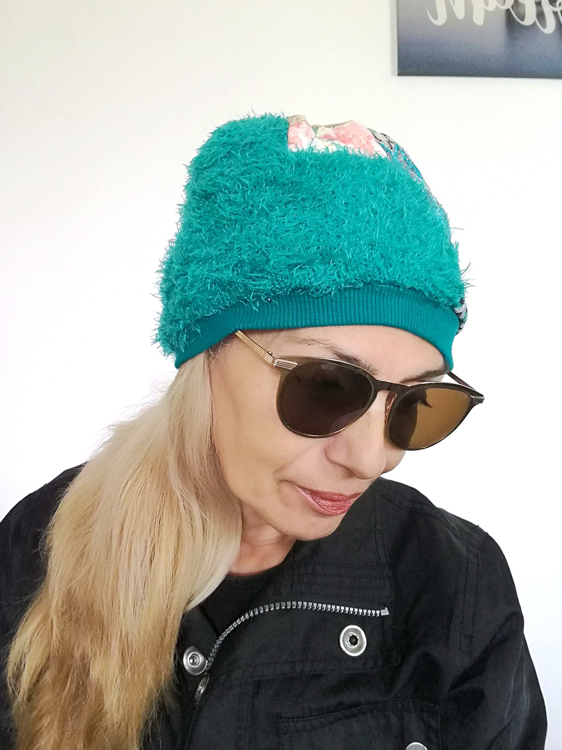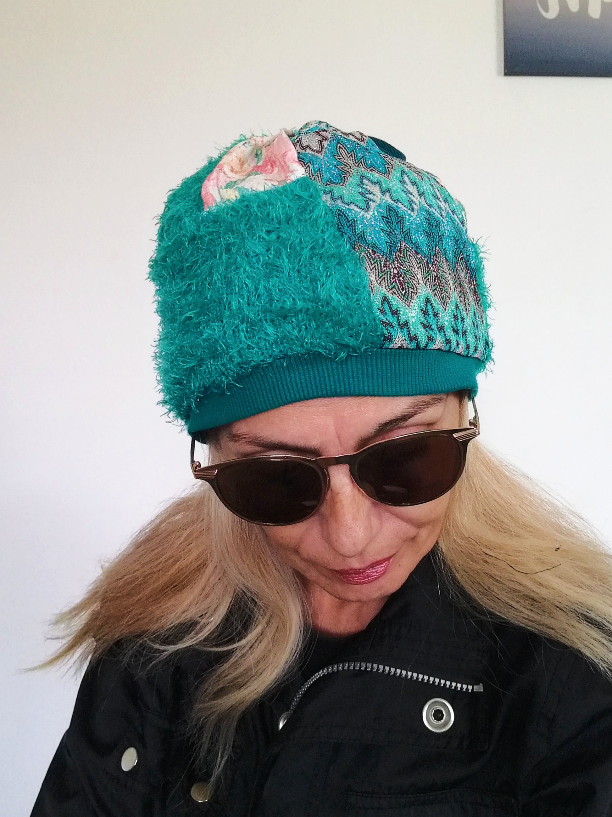 This turquoise patchwork beanie hat is designed and handmade by me.