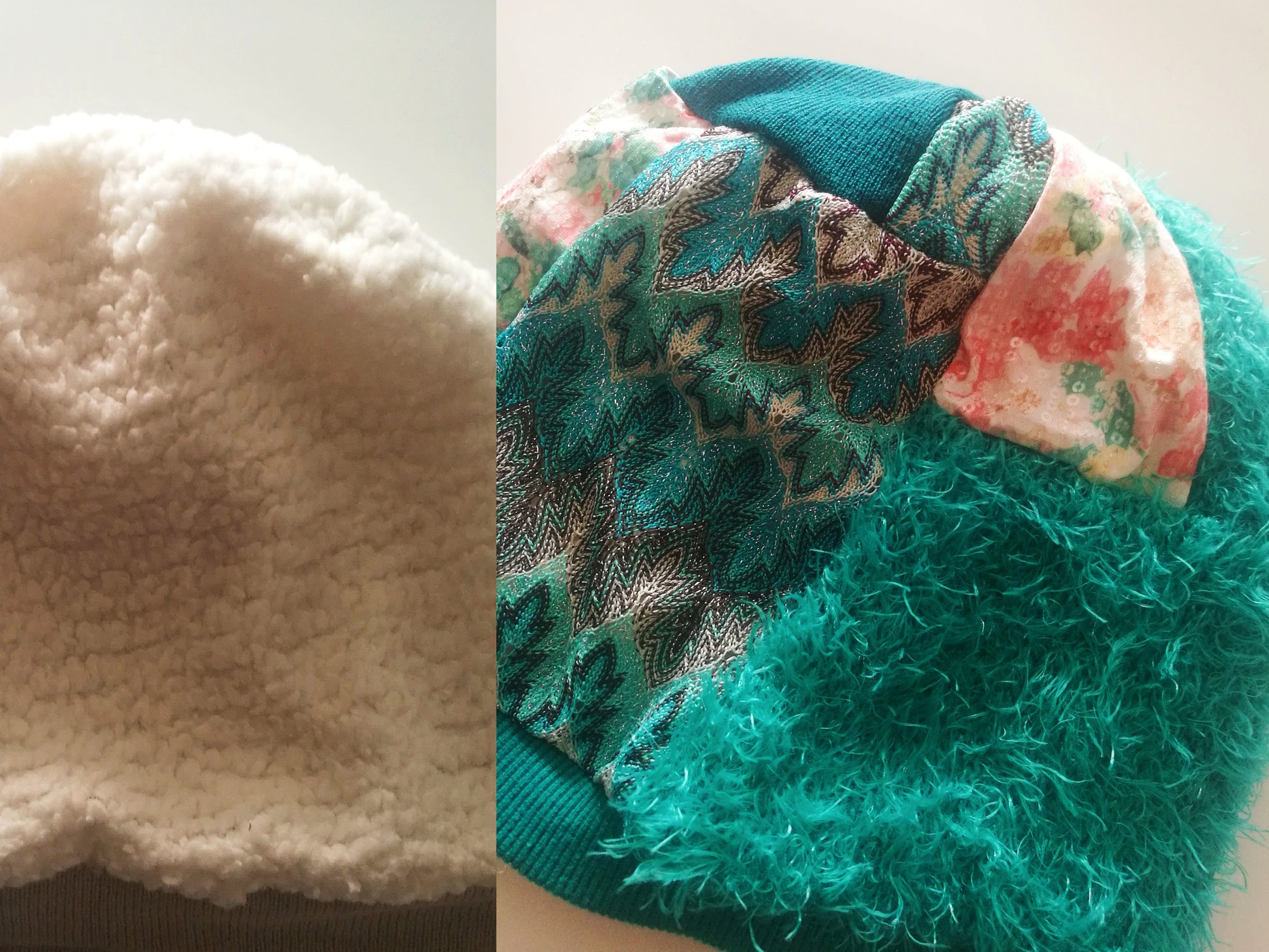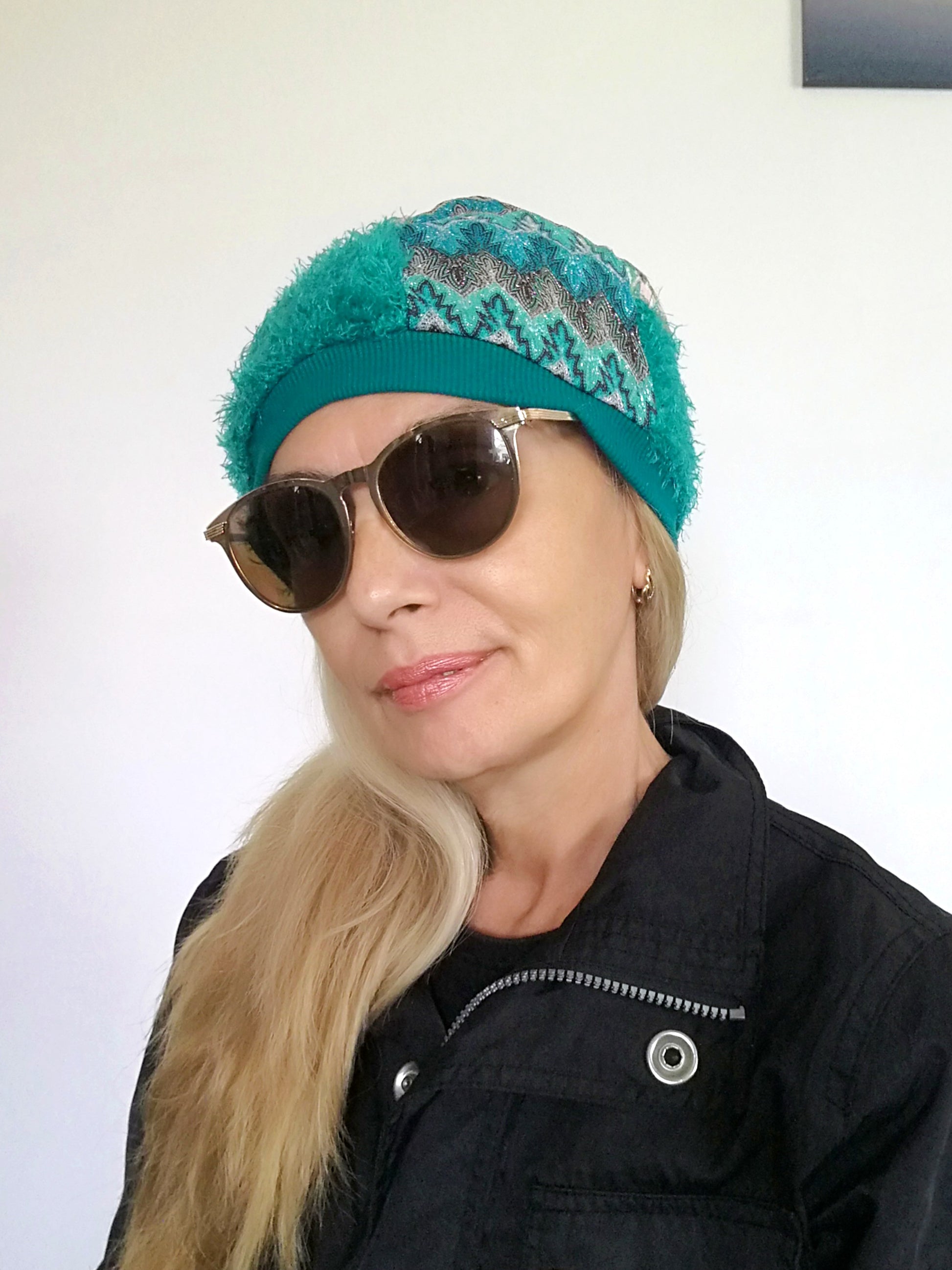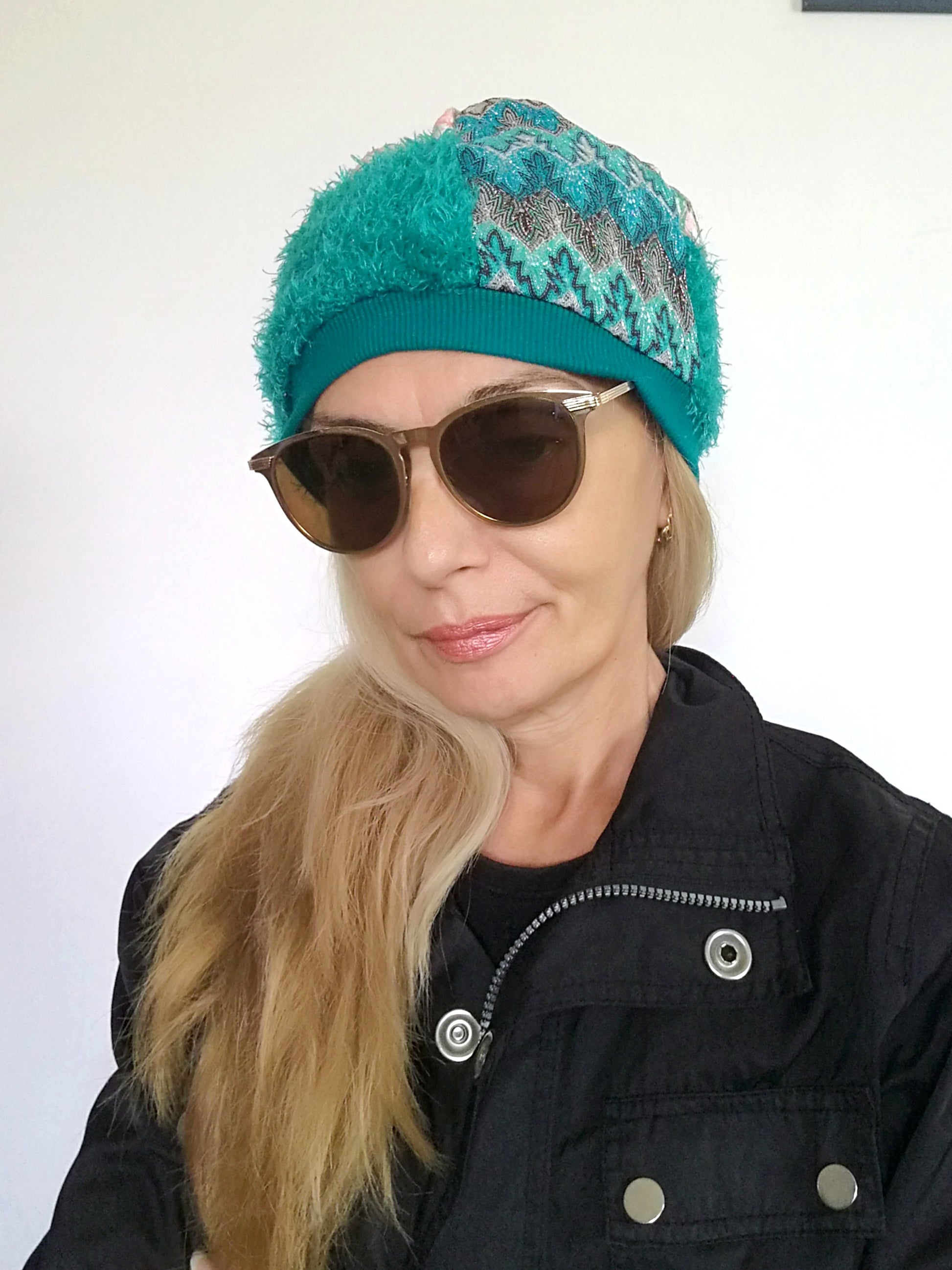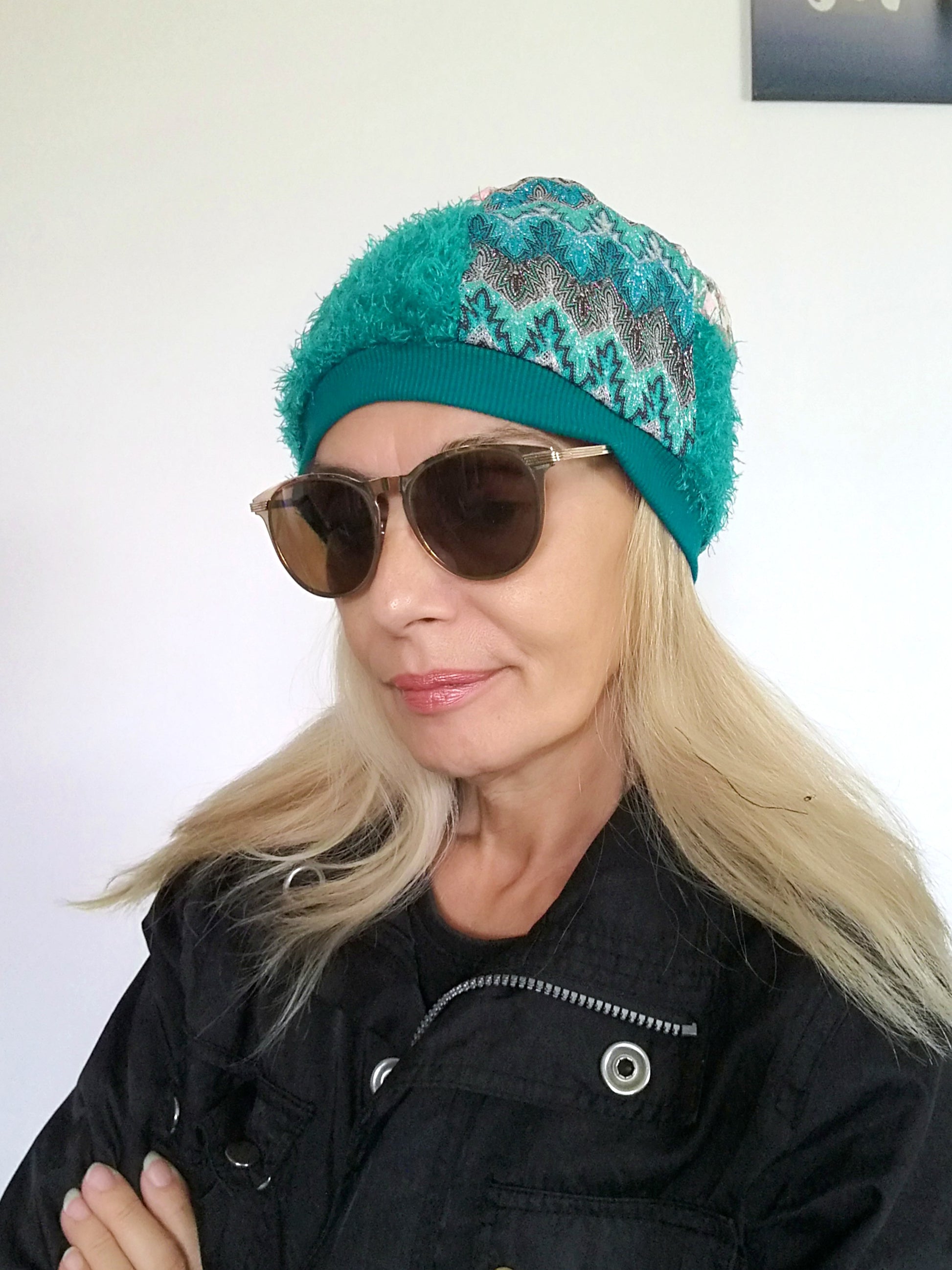 This turquoise patchwork beanie hat is designed and handmade by me.