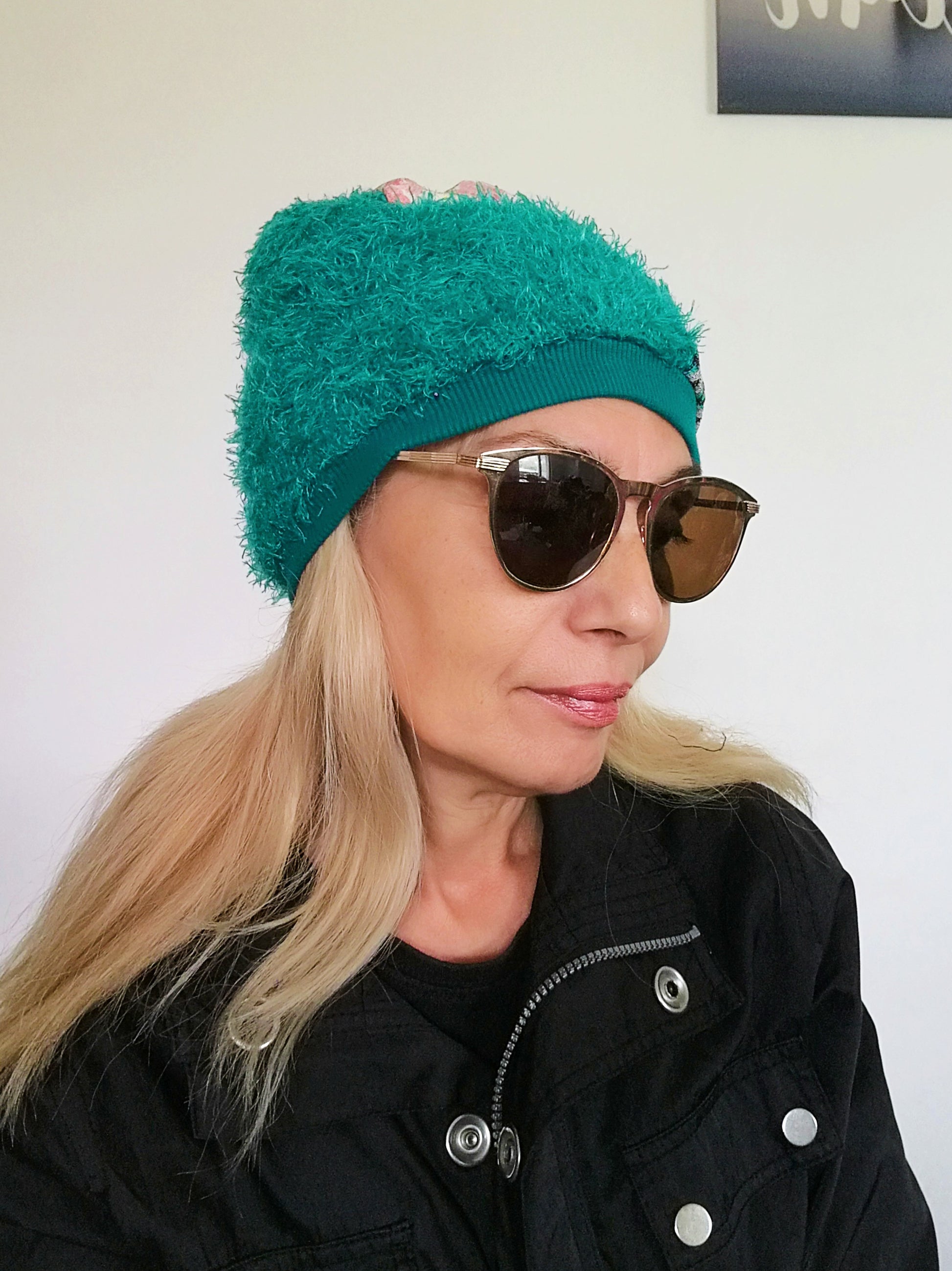 The warm beanie is made of very soft turquoise furry knit fabric, floral sequins fabric,knit fabric.