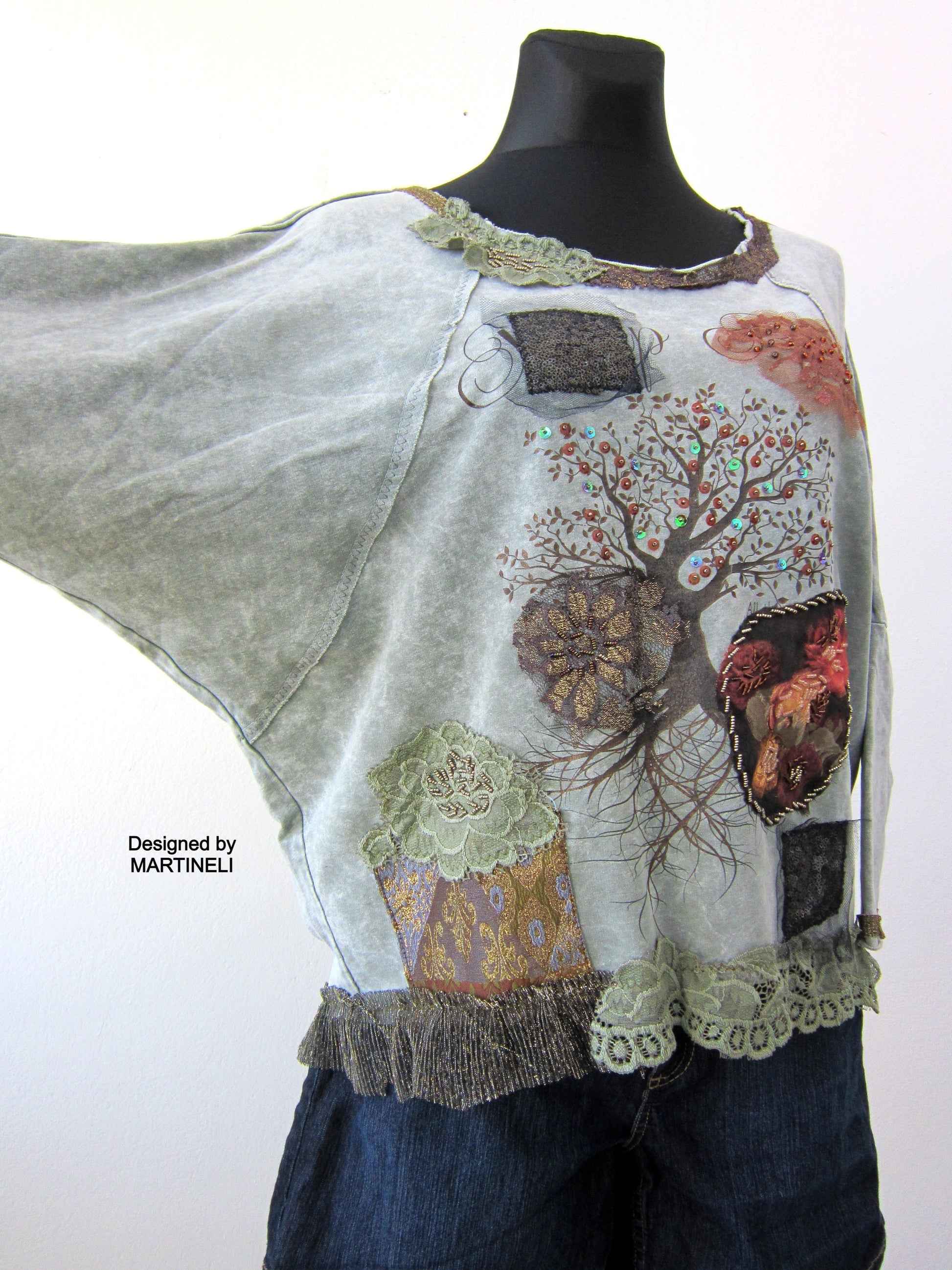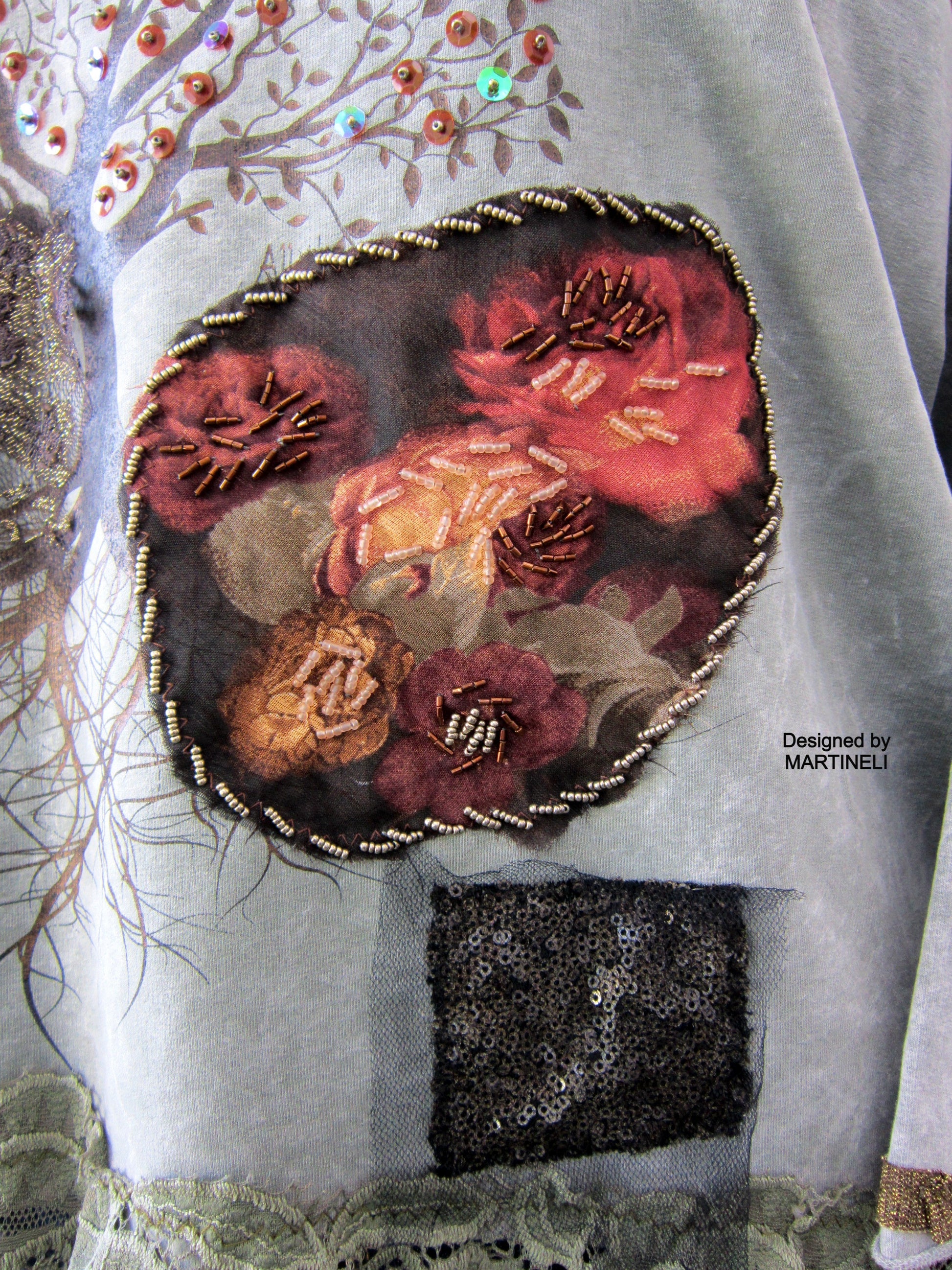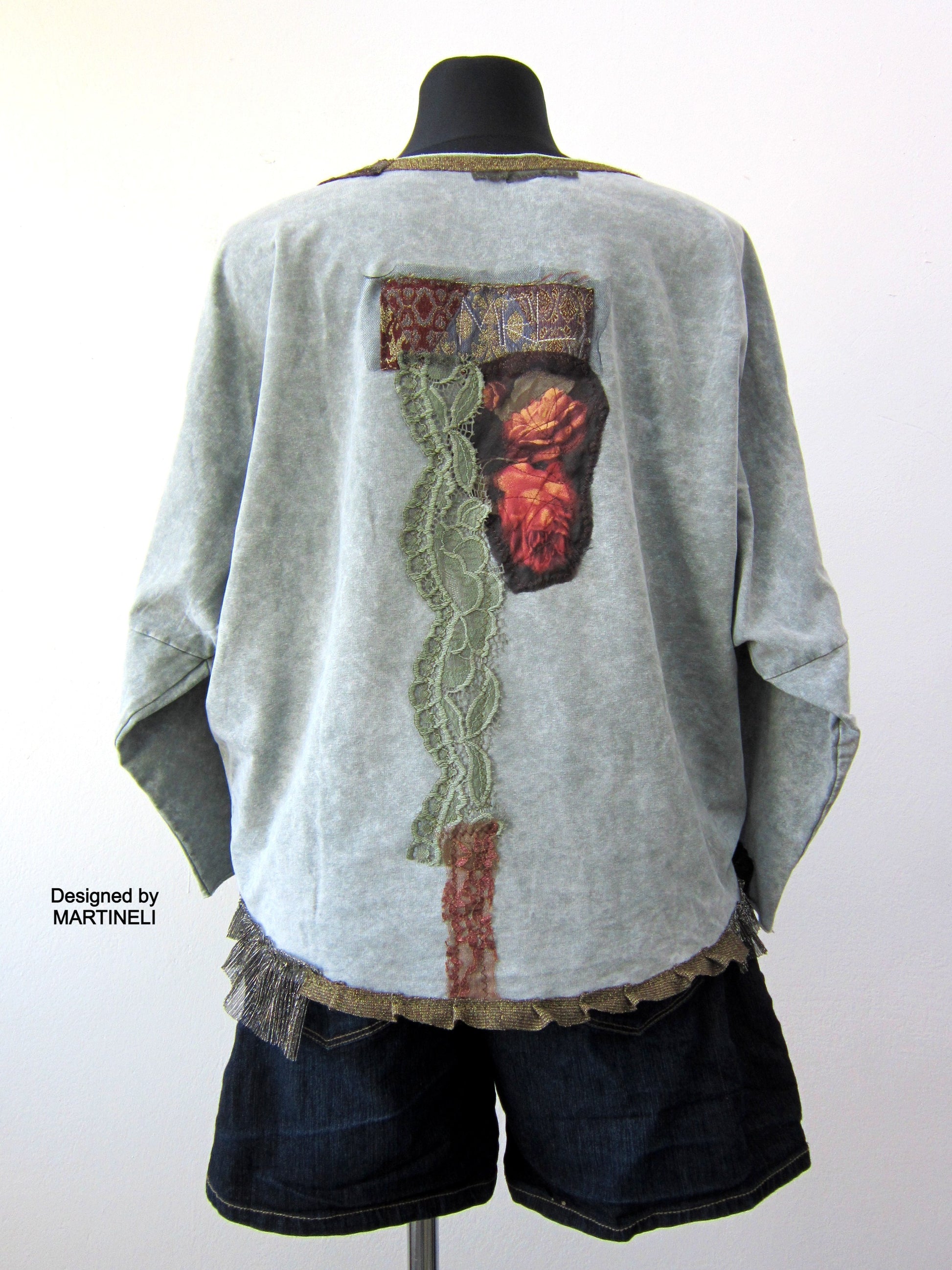 I used a very soft Italian gray stretchy cotton sweatshirt,laces, tapestry,chiffon, sequins patches. This very fine fleece cotton top is embroidered with Preciosa glass beads and sequins.