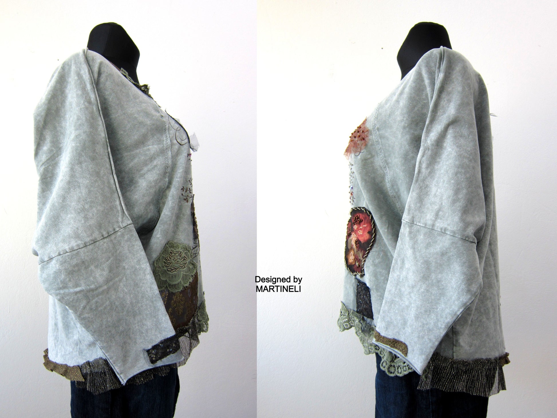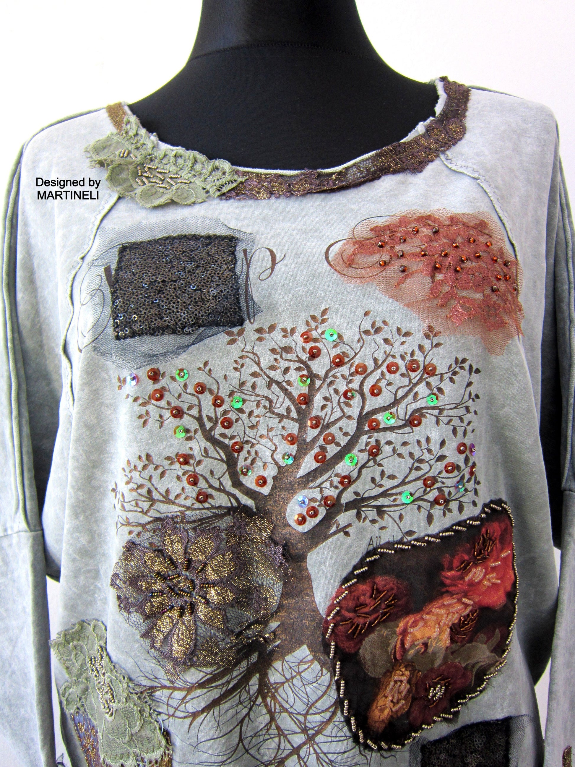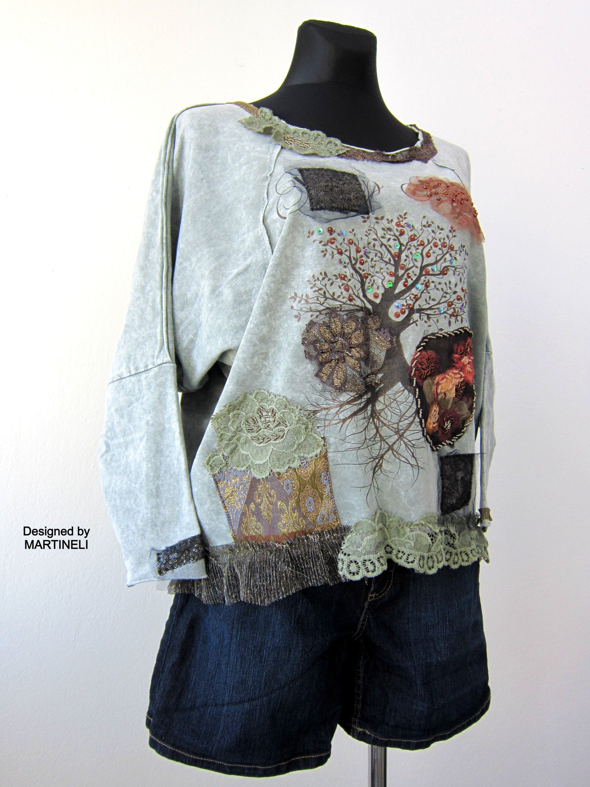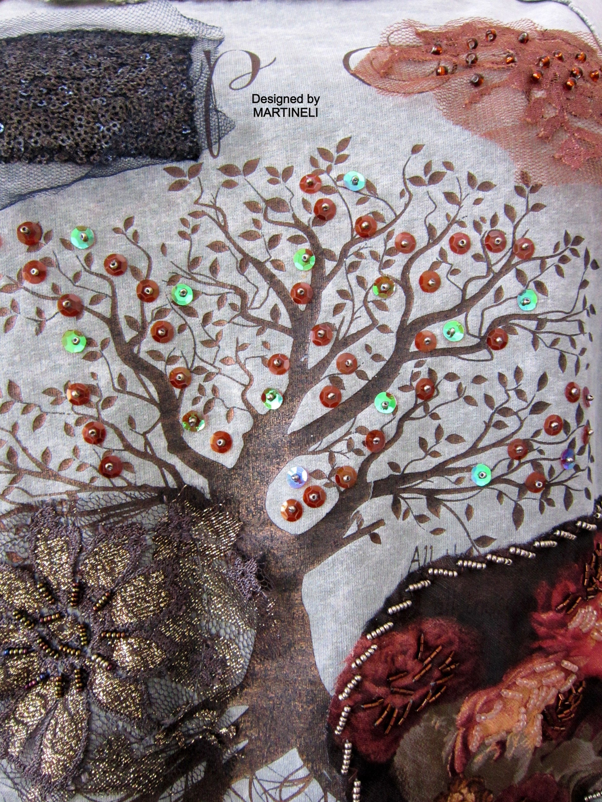 I used a very soft Italian gray stretchy cotton sweatshirt,laces, tapestry,chiffon, sequins patches. This very fine fleece cotton top is embroidered with Preciosa glass beads and sequins.
