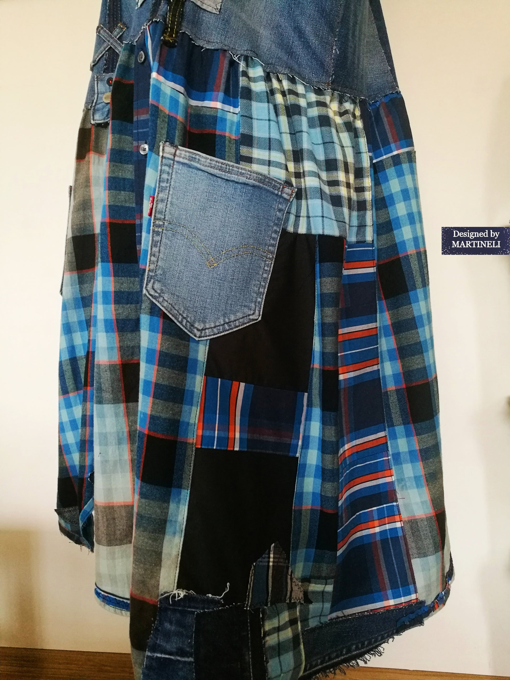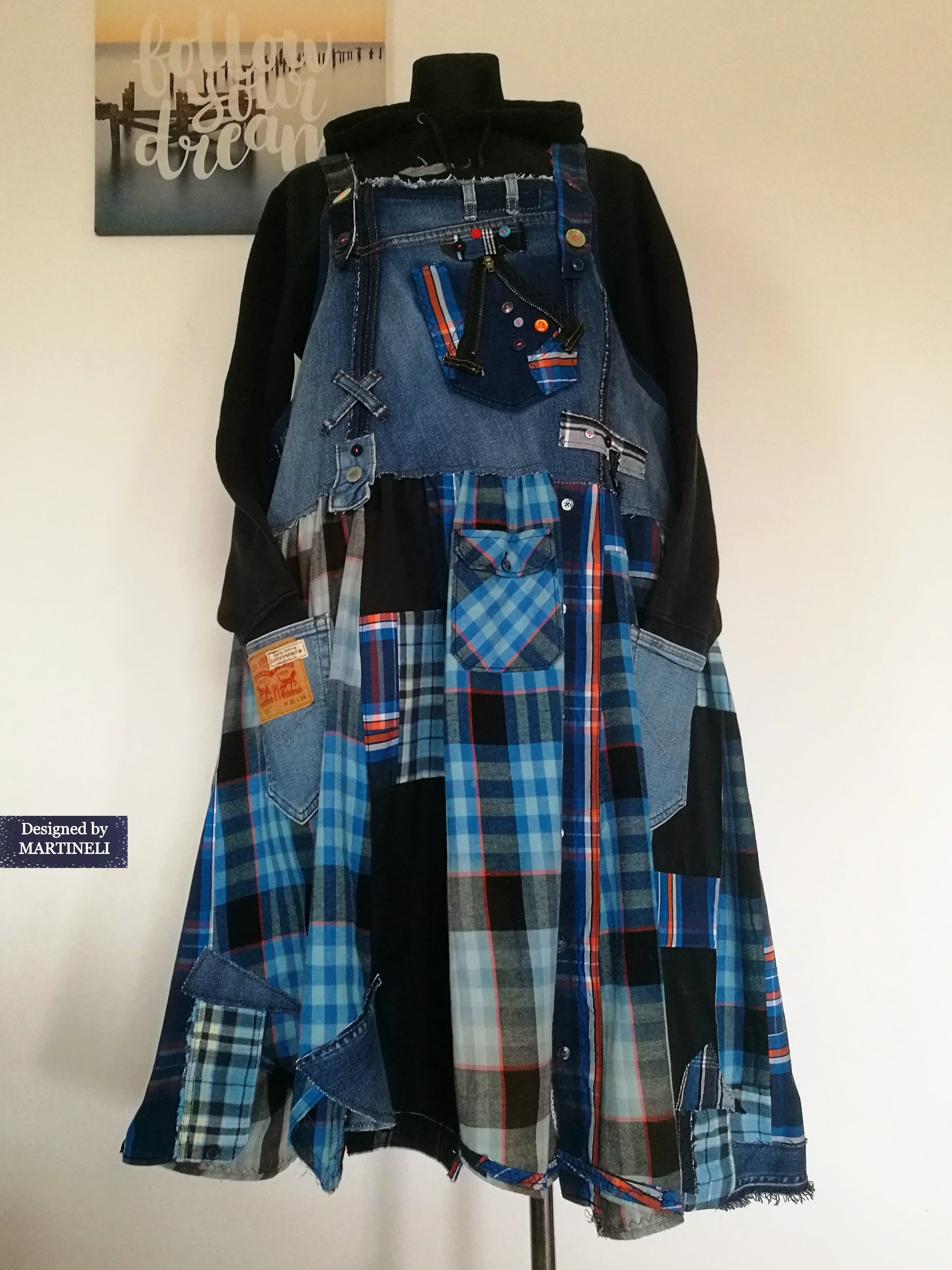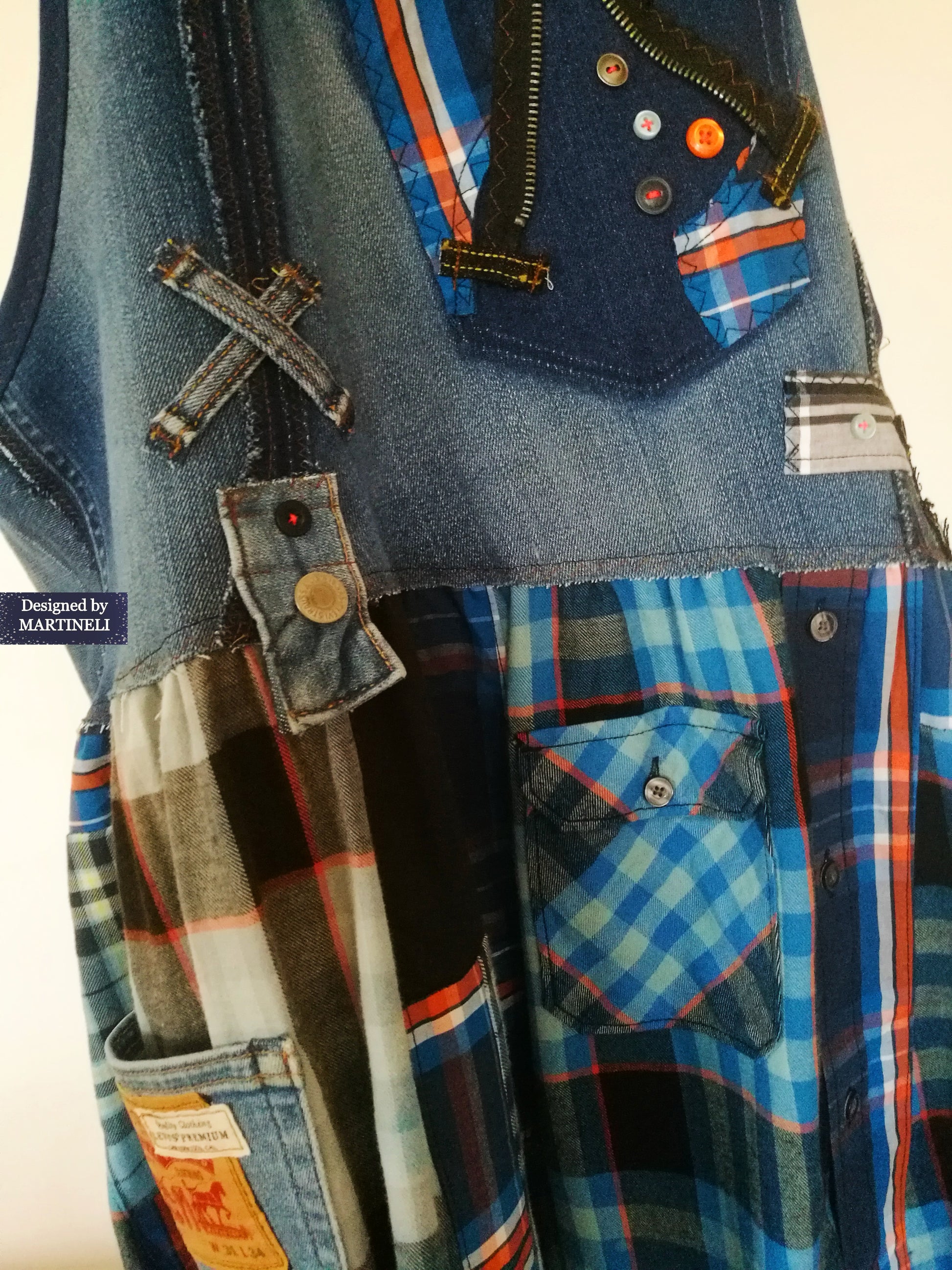 I used ORIGINAL LEVI`S blue jeans, gray washed denim, plaid cotton in blue/orange/black, black cotton.
