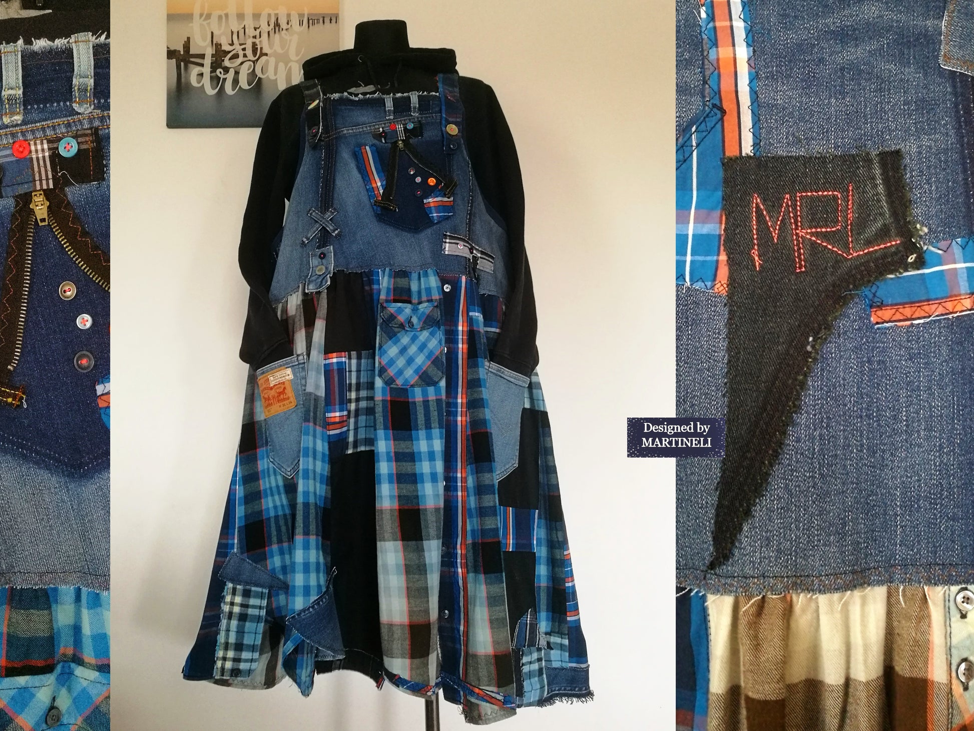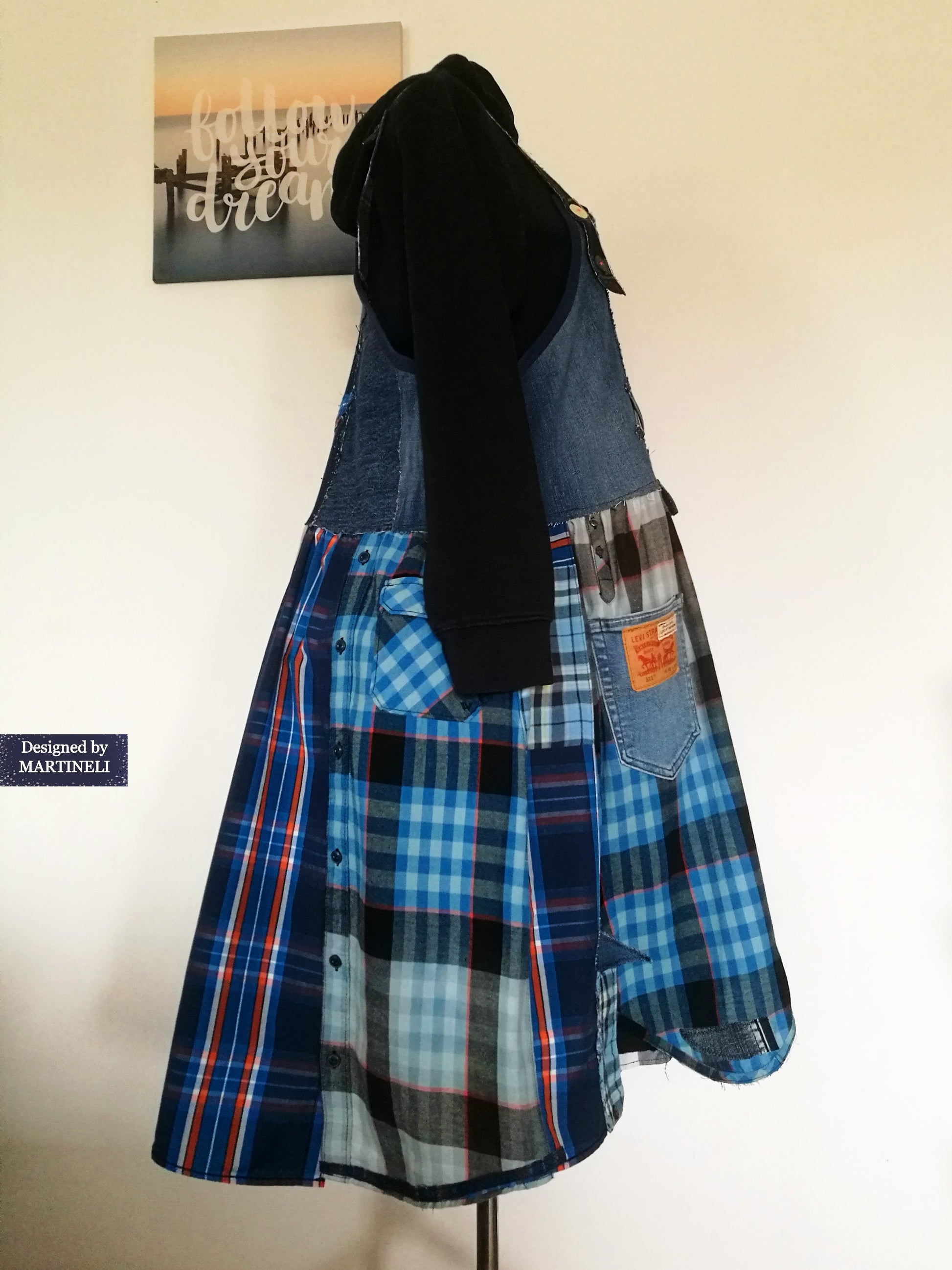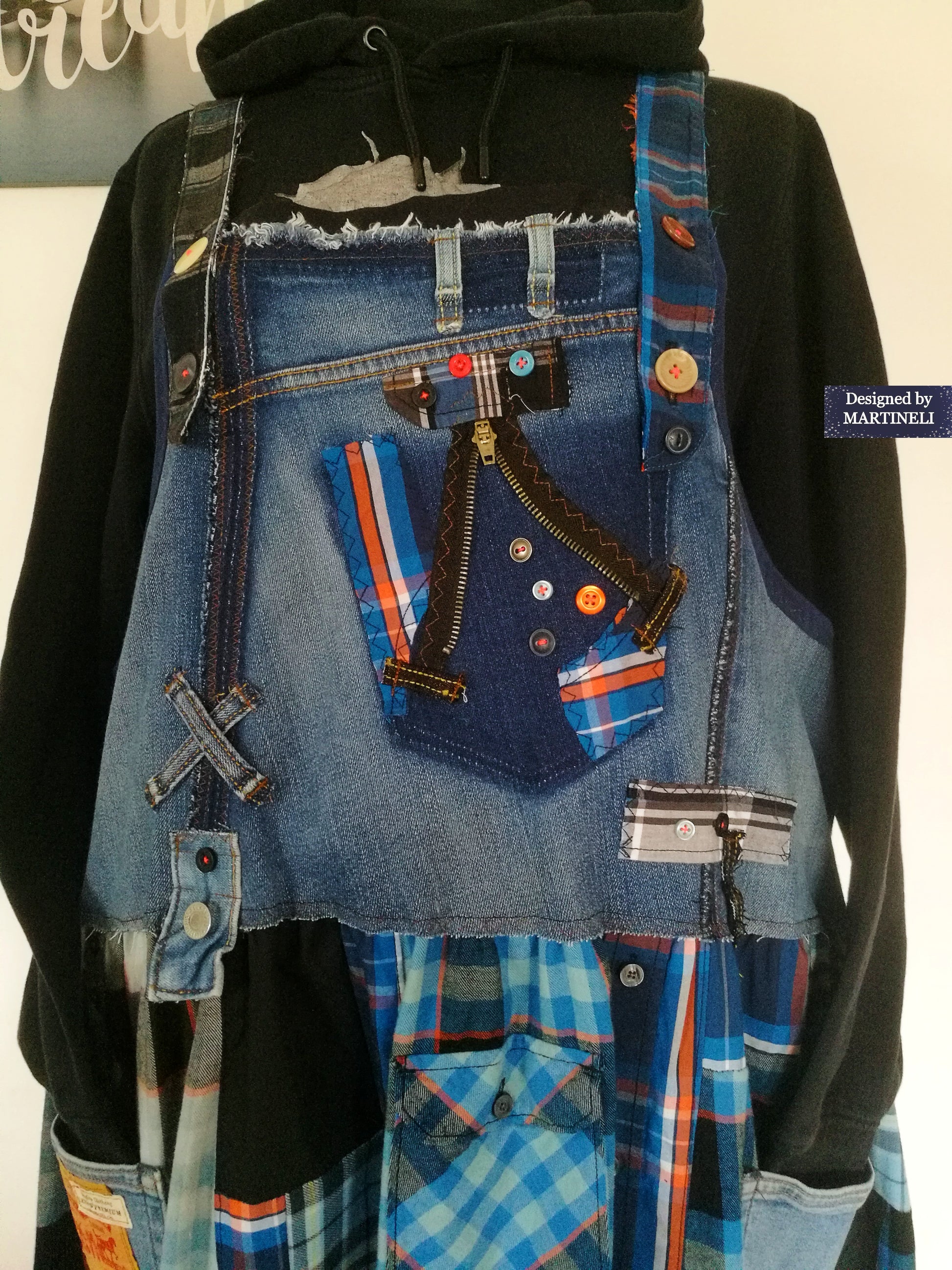 I used ORIGINAL LEVI`S blue jeans, gray washed denim, plaid cotton in blue/orange/black, black cotton.