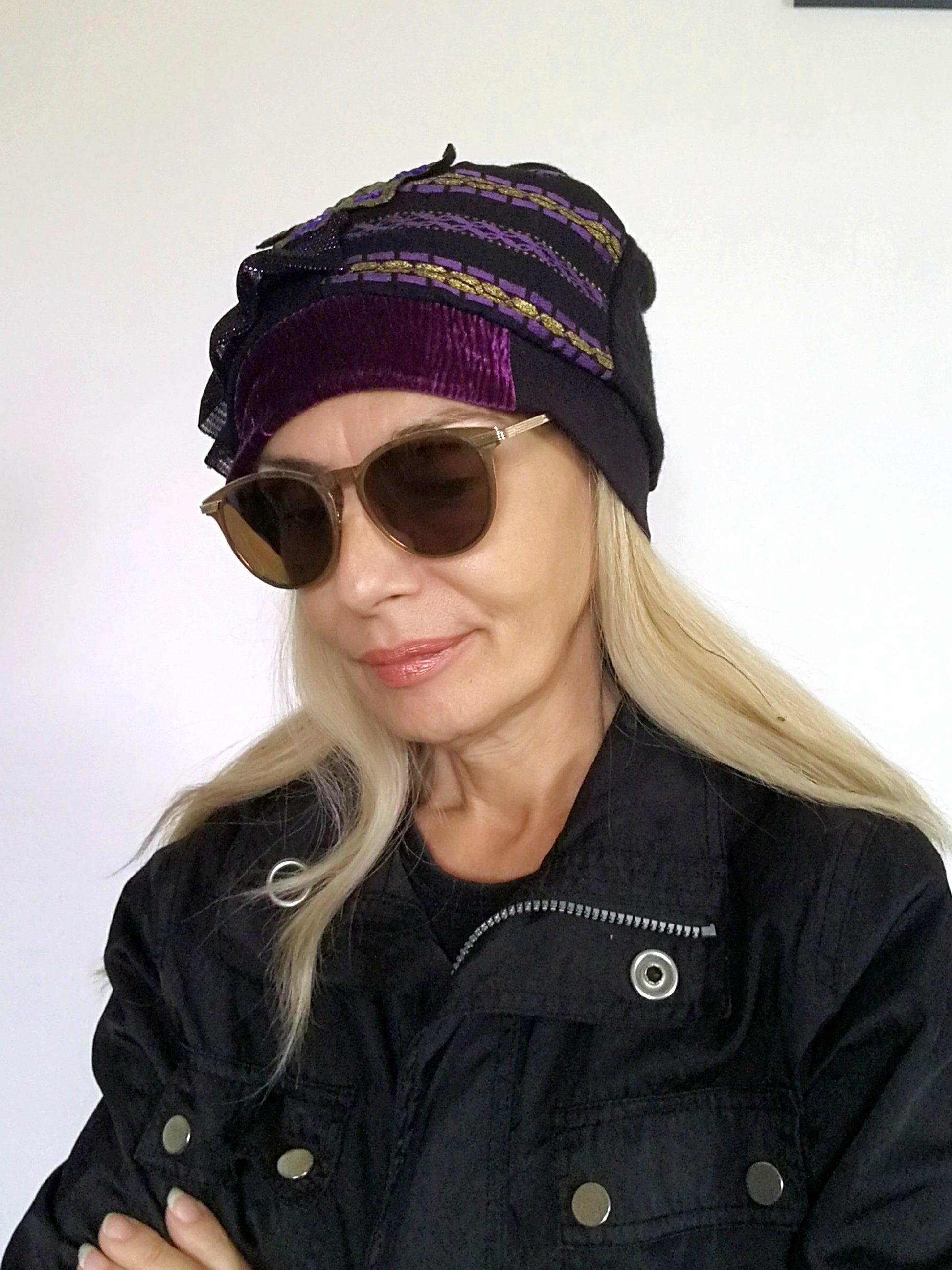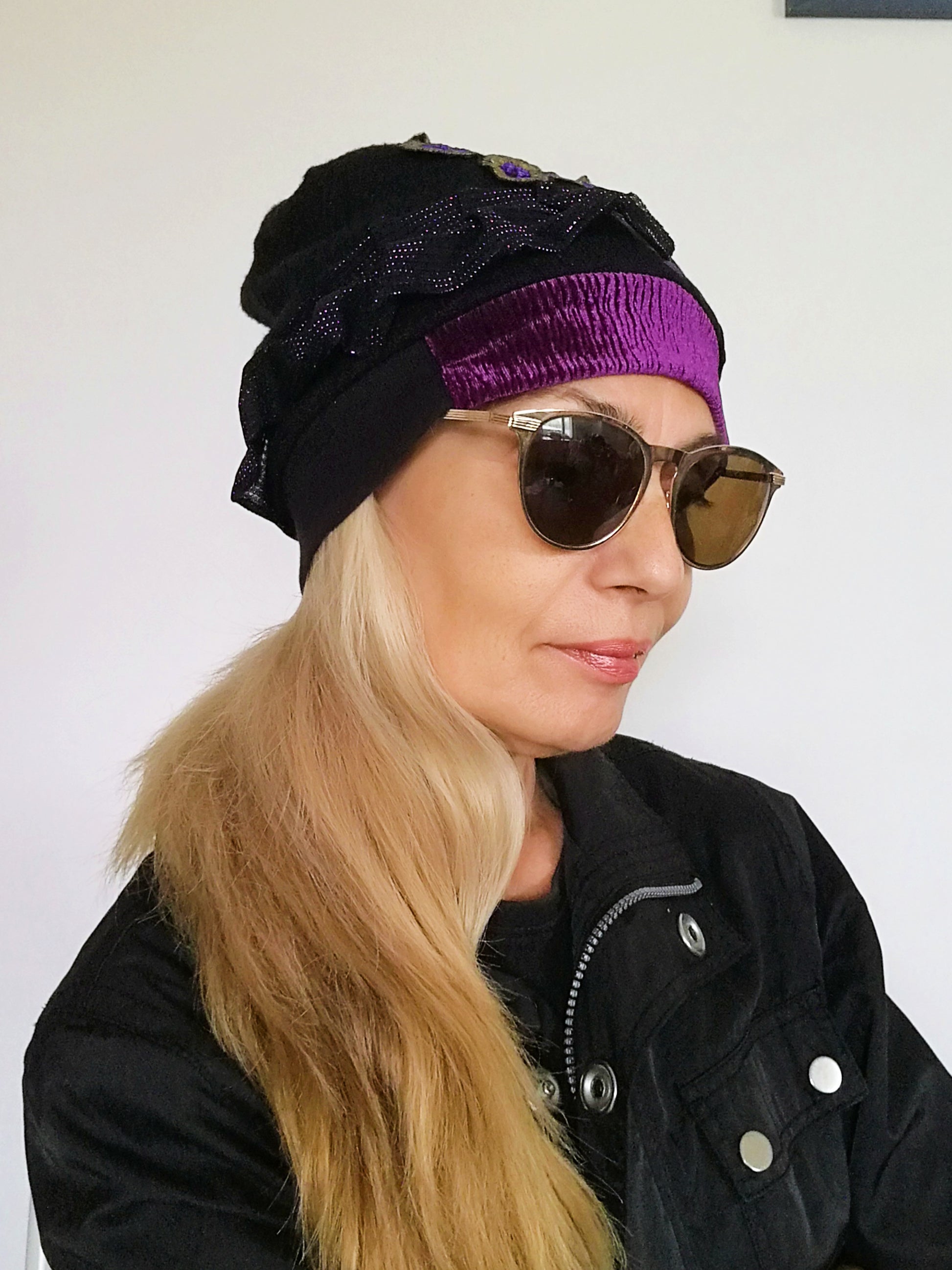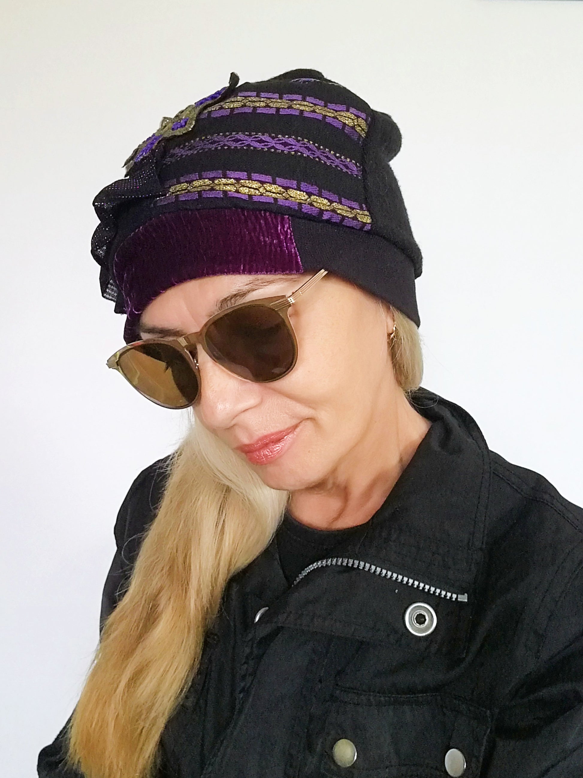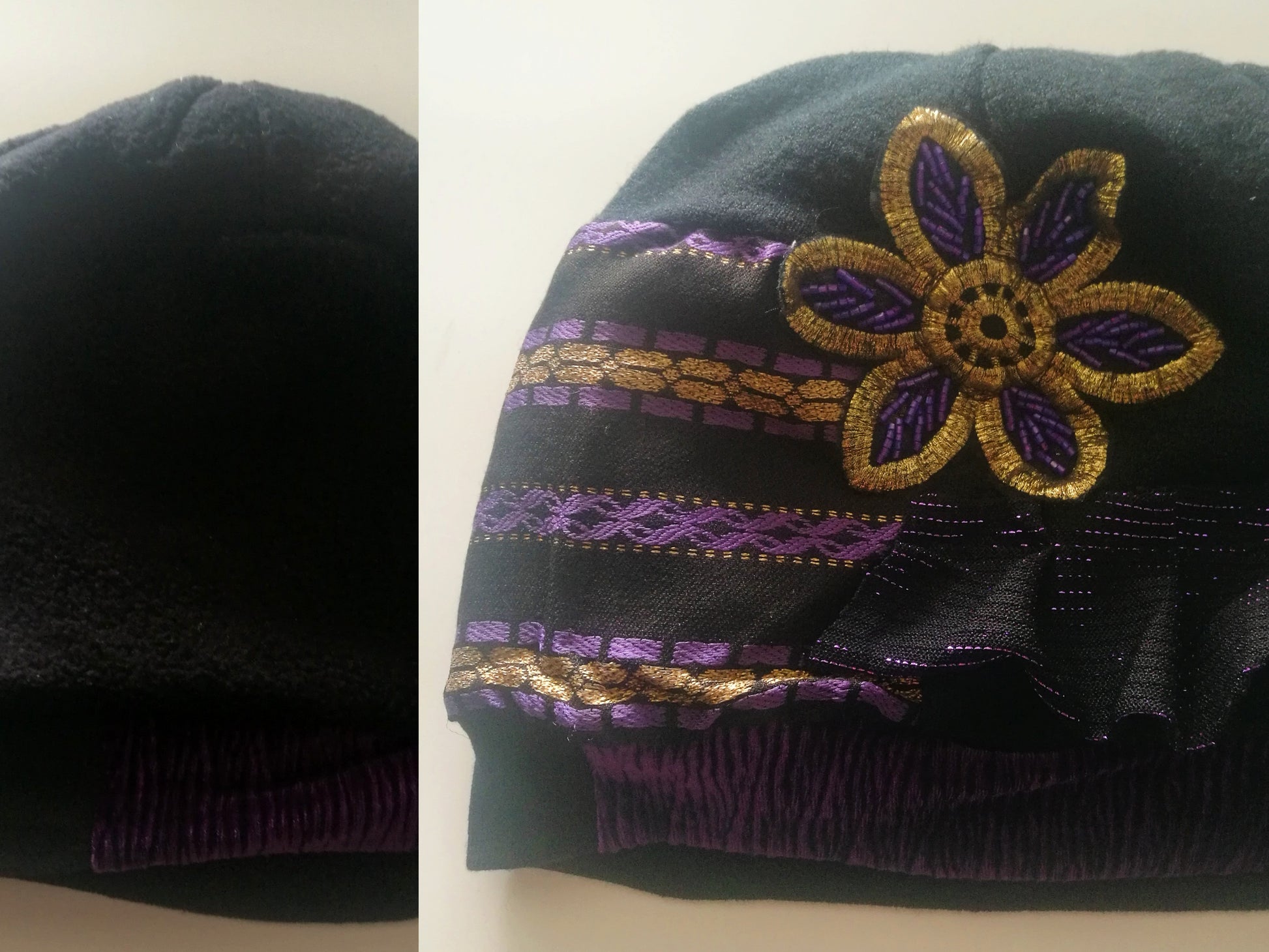 The slouchy beanie is made of very soft black knit wool/acrylic blend, tapestry fabric in black/purple/gold, big gold flower embroidered with Preciosa glass beads ,black/purple jersey,purple velvet.